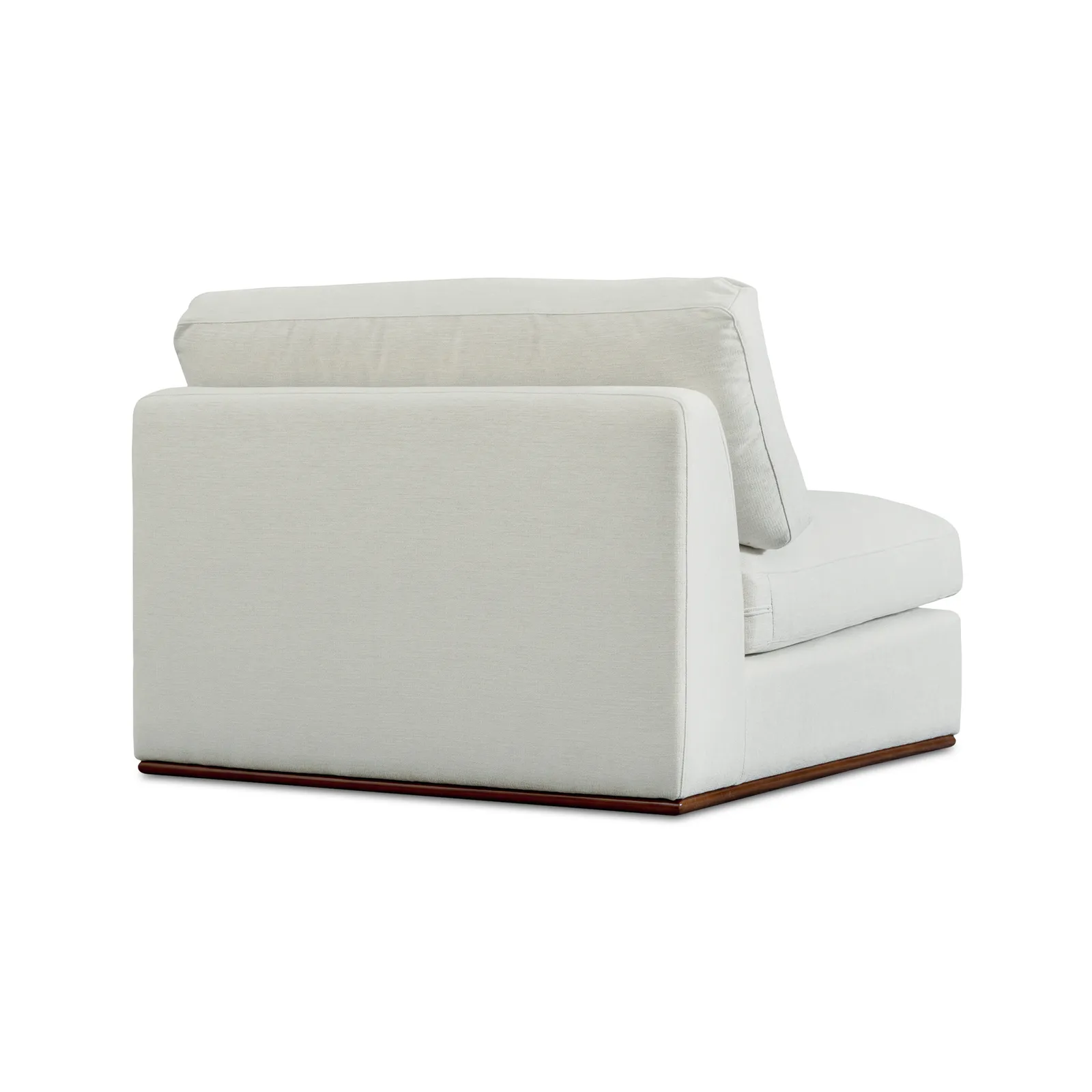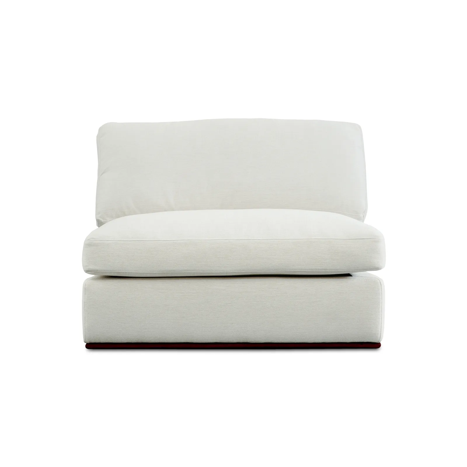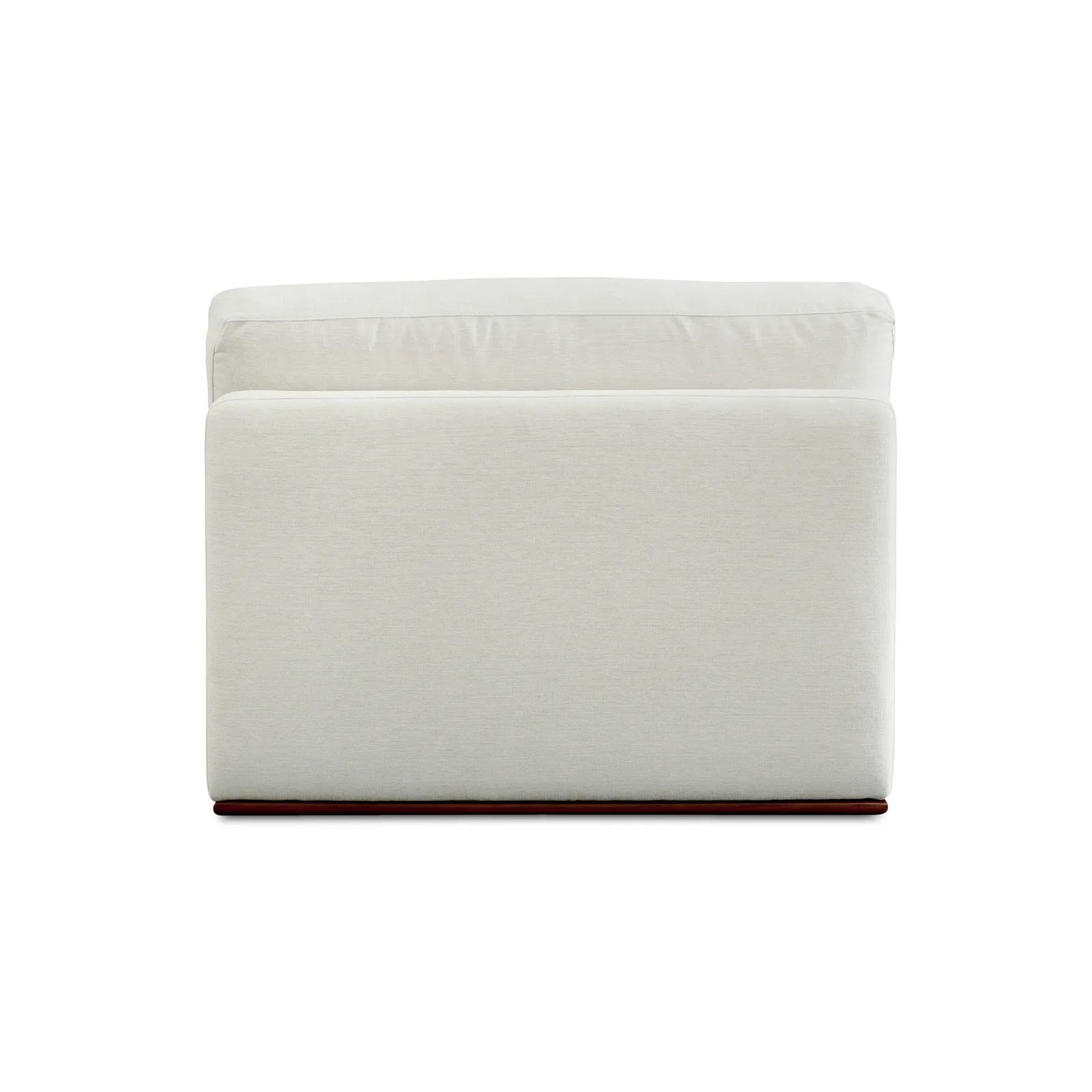 The Rue chair features a generous 70% feather-fill topper within its seat for an added layer of coziness. Its elegant silhouette is highlighted by a rubber wood base, creating a sleek floating appearance, all supported by subtle wooden legs. Designed with extreme comfort in mind, this modular chair embodies easy, neutral styling.