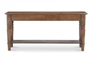 The Russet console table features beautifully turned legs, intricately carved details, and a mid-tone brown finish that fits seamlessly into traditional and transitional homes. Adding to its charm are two large horizontal drawers for additional storage with a shelf underneath. These are complemented by an overhanging tabletop that enhances its classic aesthetic–a timeless centerpiece, enriching the dining experience with style and functionality.