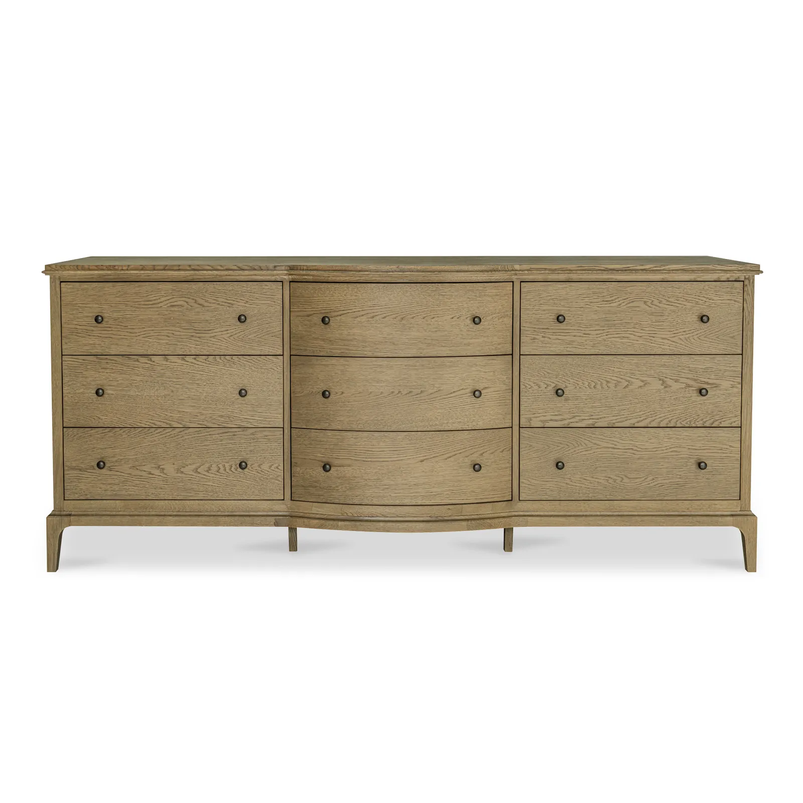 The Sadie 9-drawer dresser’s gentle curves and wire-brushed oak finish embrace modern traditionalism. The artfully designed overhang with rounded edges and curved front offers a soothing visual rhythm. Nine spacious drawers with delicate metal knobs provide ample storage, balancing form and function.