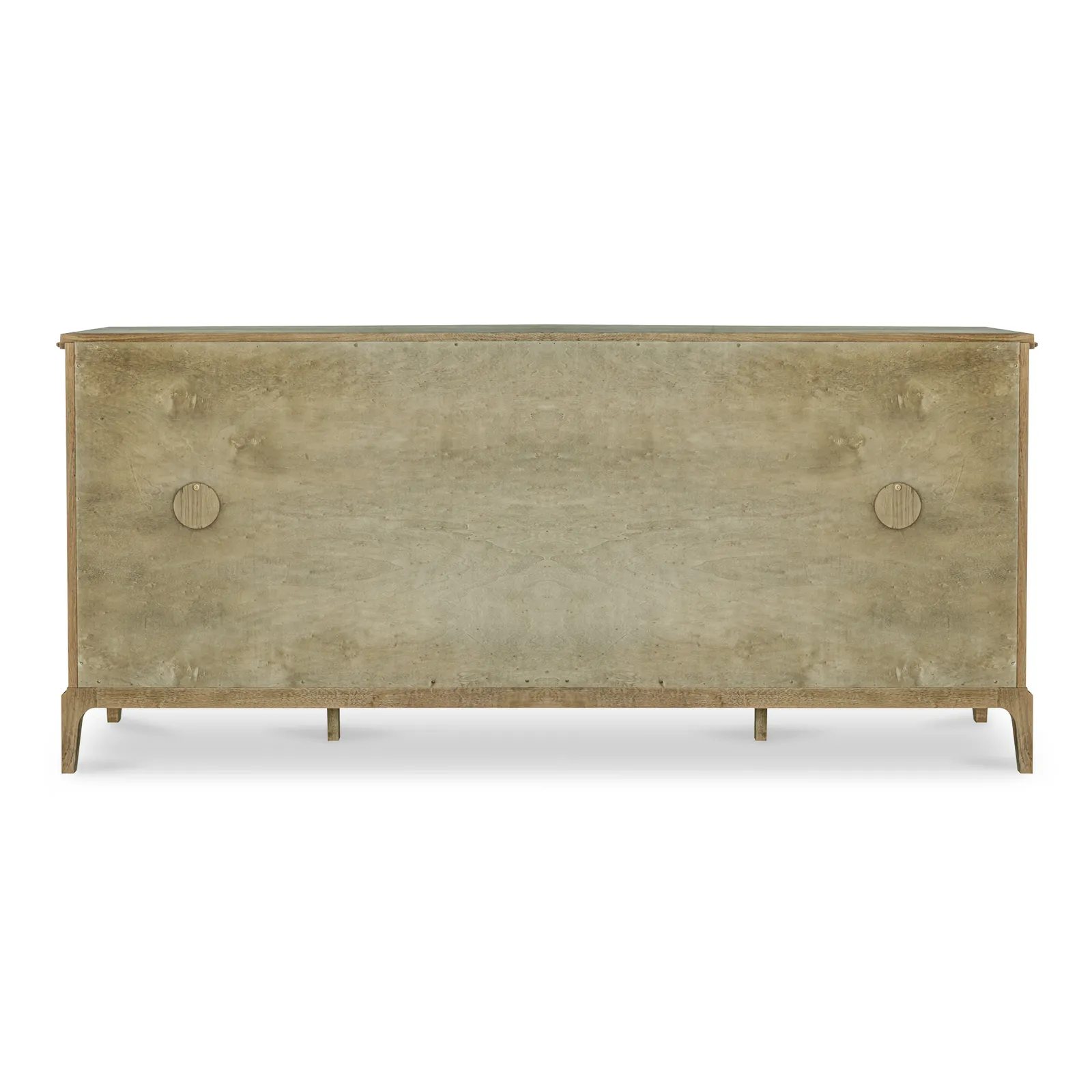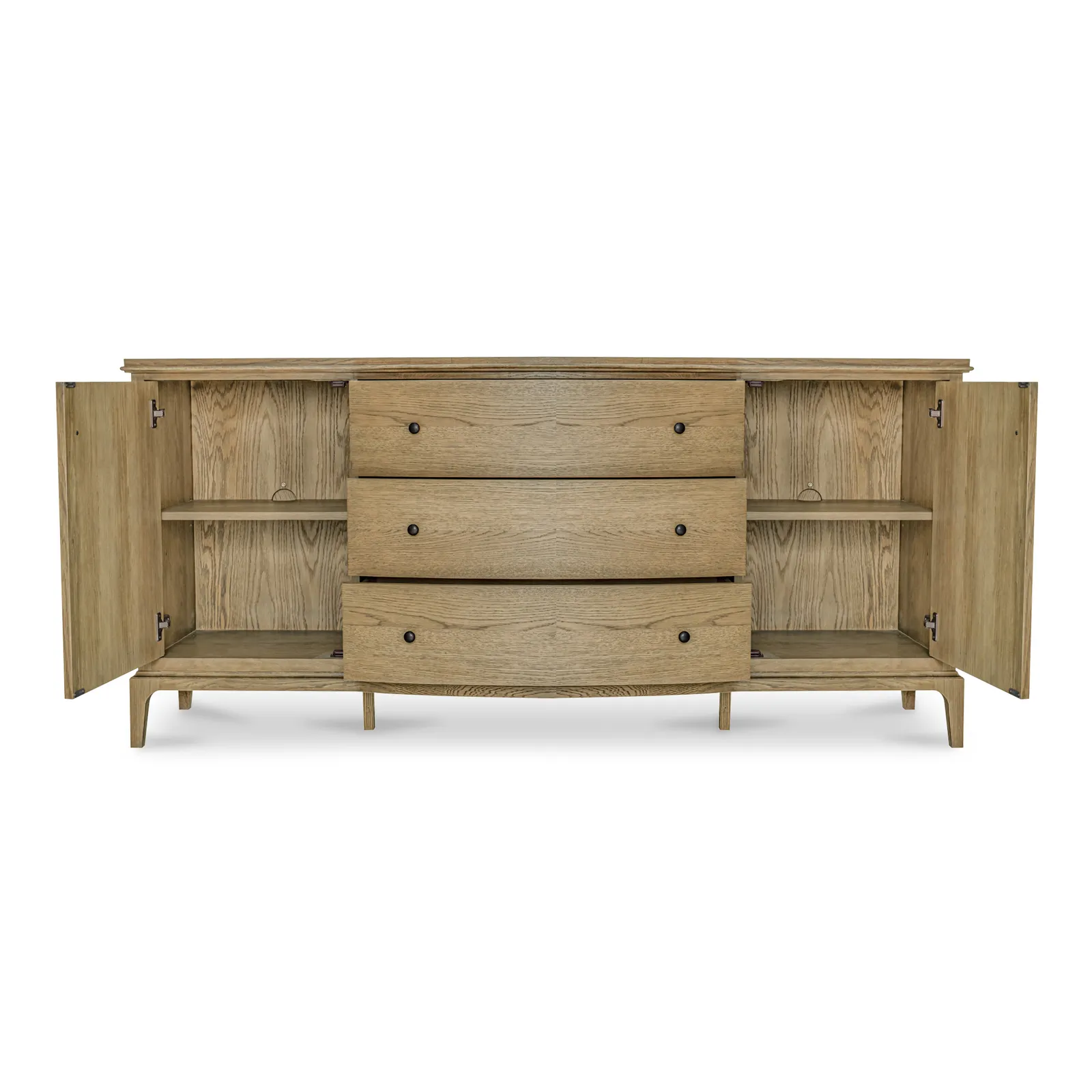 The Sadie sideboard’s gentle curves and wire-brushed oak finish embrace modern traditionalism. The artfully designed overhang with rounded edges and curved front offers a soothing visual rhythm. Three middle drawers provide ample storage, while two holes for media cables allow practical organization.