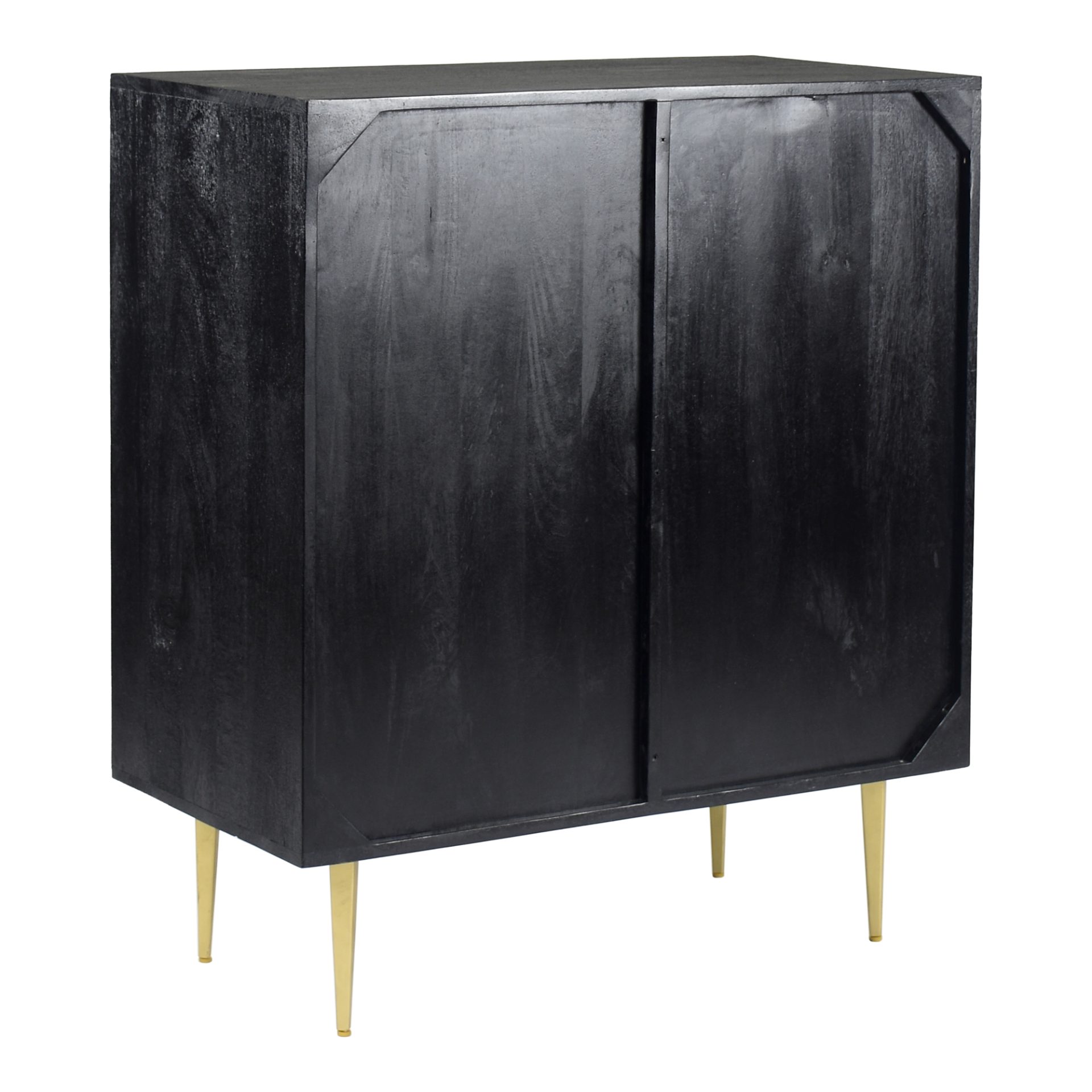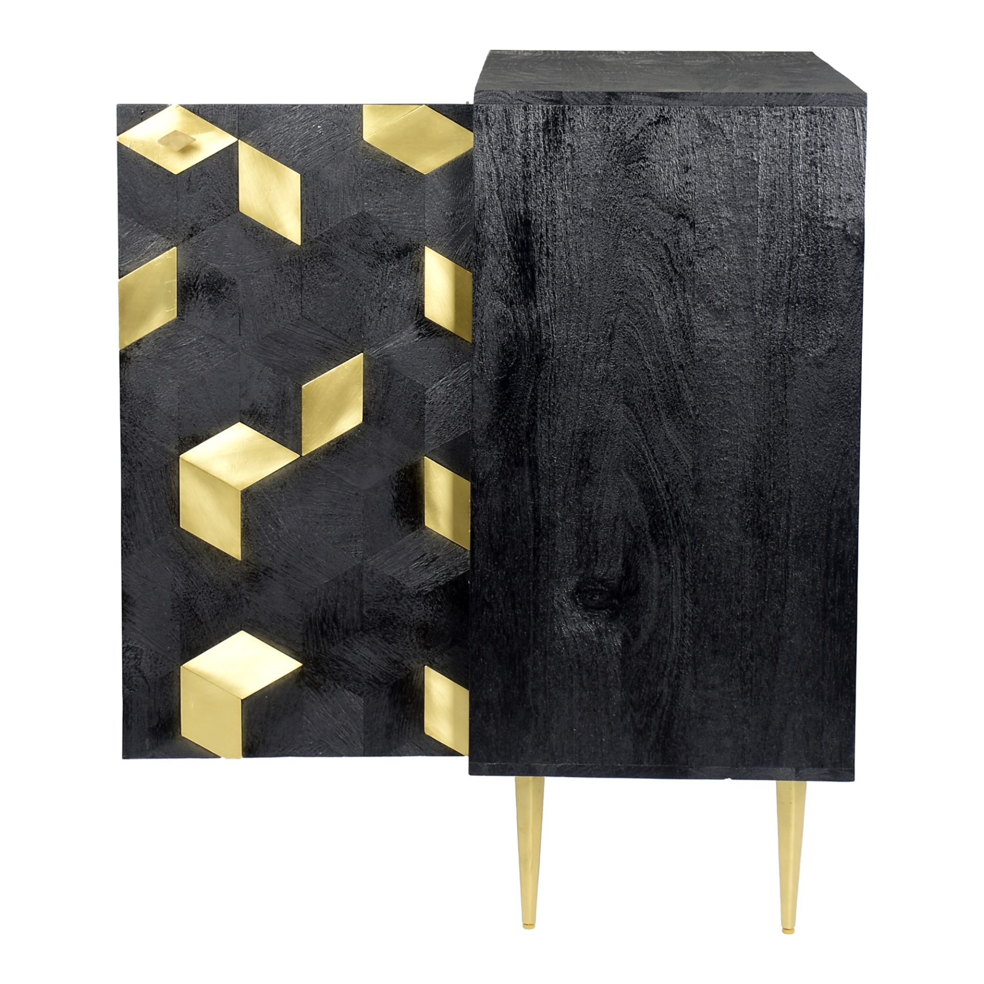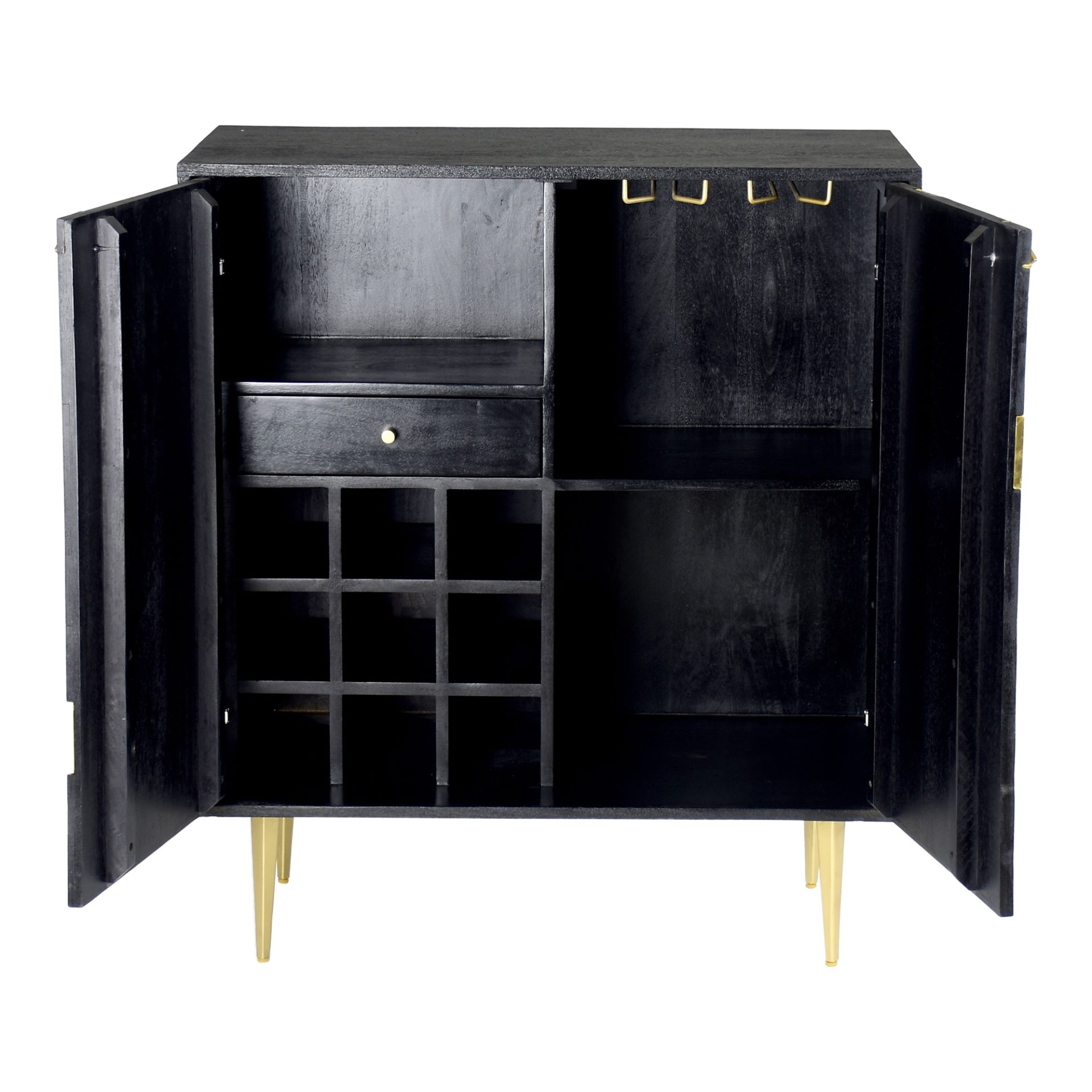 A sweet escape for all of your things. The Sapporo cabinet features darkened natural mango wood juxtaposed with bright geometric accents of brass foil. Its two large doors open to reveal plenty of storage for all your treasures, with shelving, bottle racks, and a single drawer. With Art Deco inspired flair, this cabinet serves as the perfect accent and storage solution for your living space.