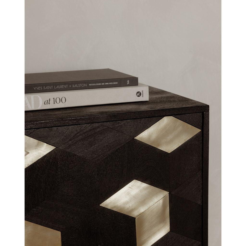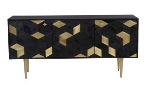 A sweet escape for all of your things. The Sapporo Sideboard features darkened natural mango wood juxtaposed with geometric brass foil patterns for a creative look. With three swinging doors, this sideboard offers plenty of room to keep your home organized out of sight.