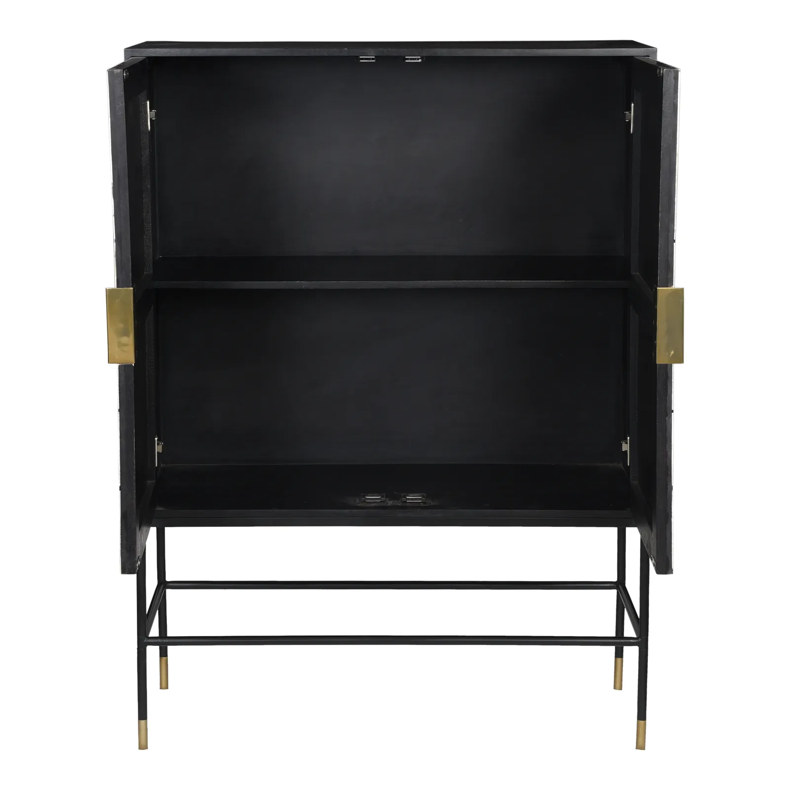 An aesthete’s delight. The Shaws cabinet is a luxurious affair of solid mango wood and ornate bone veneer. Two large doors open up to an abundance of shelving space. Brass details finish off this imposing piece.