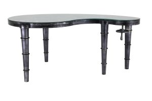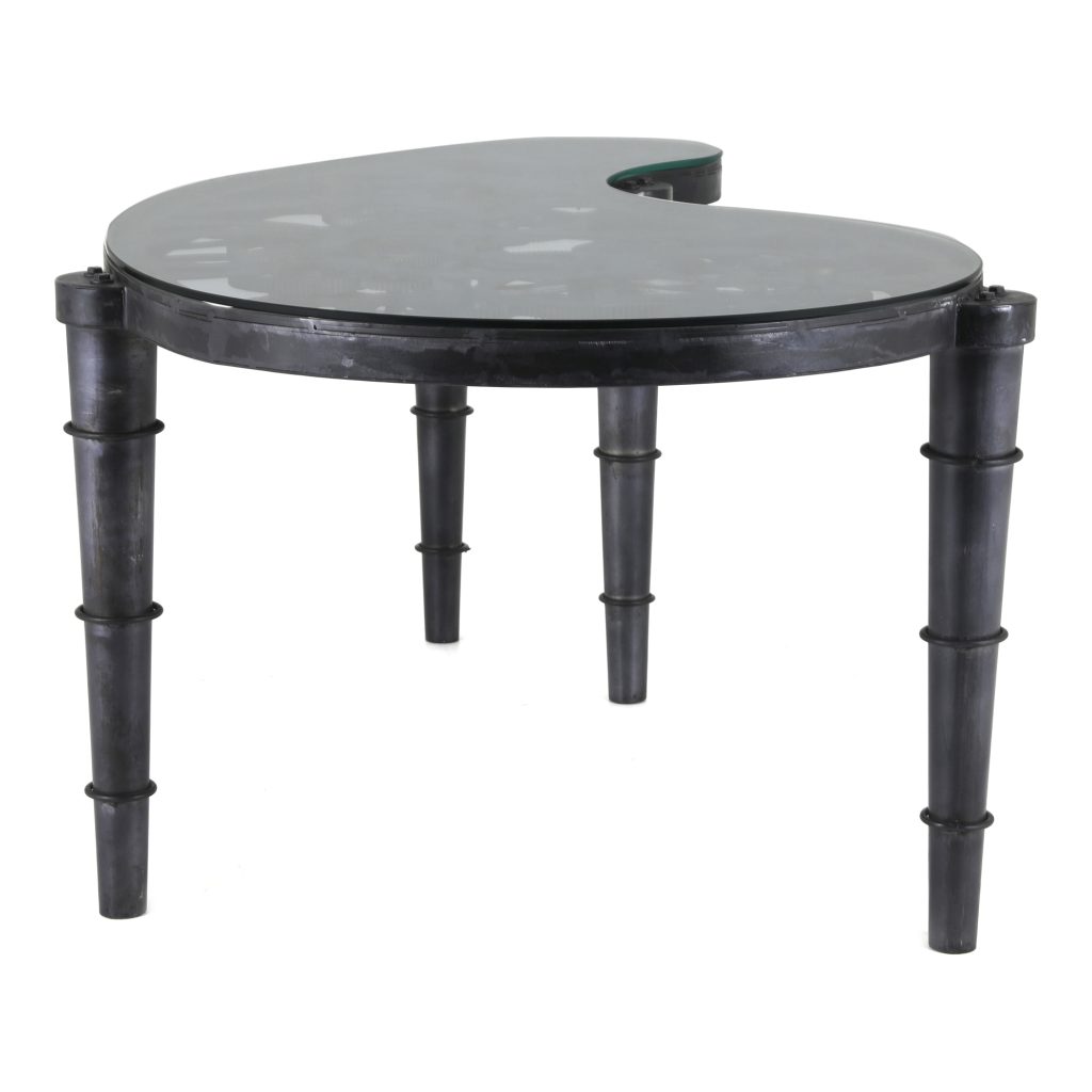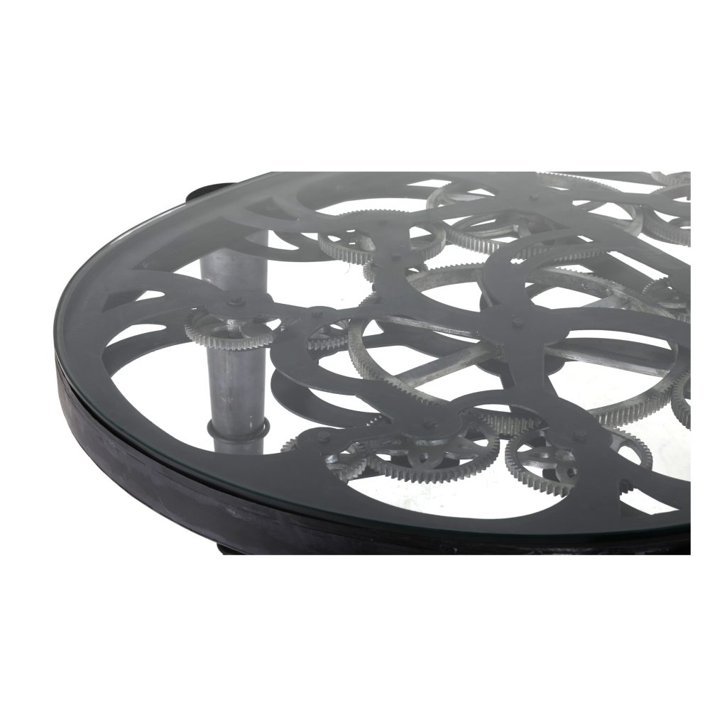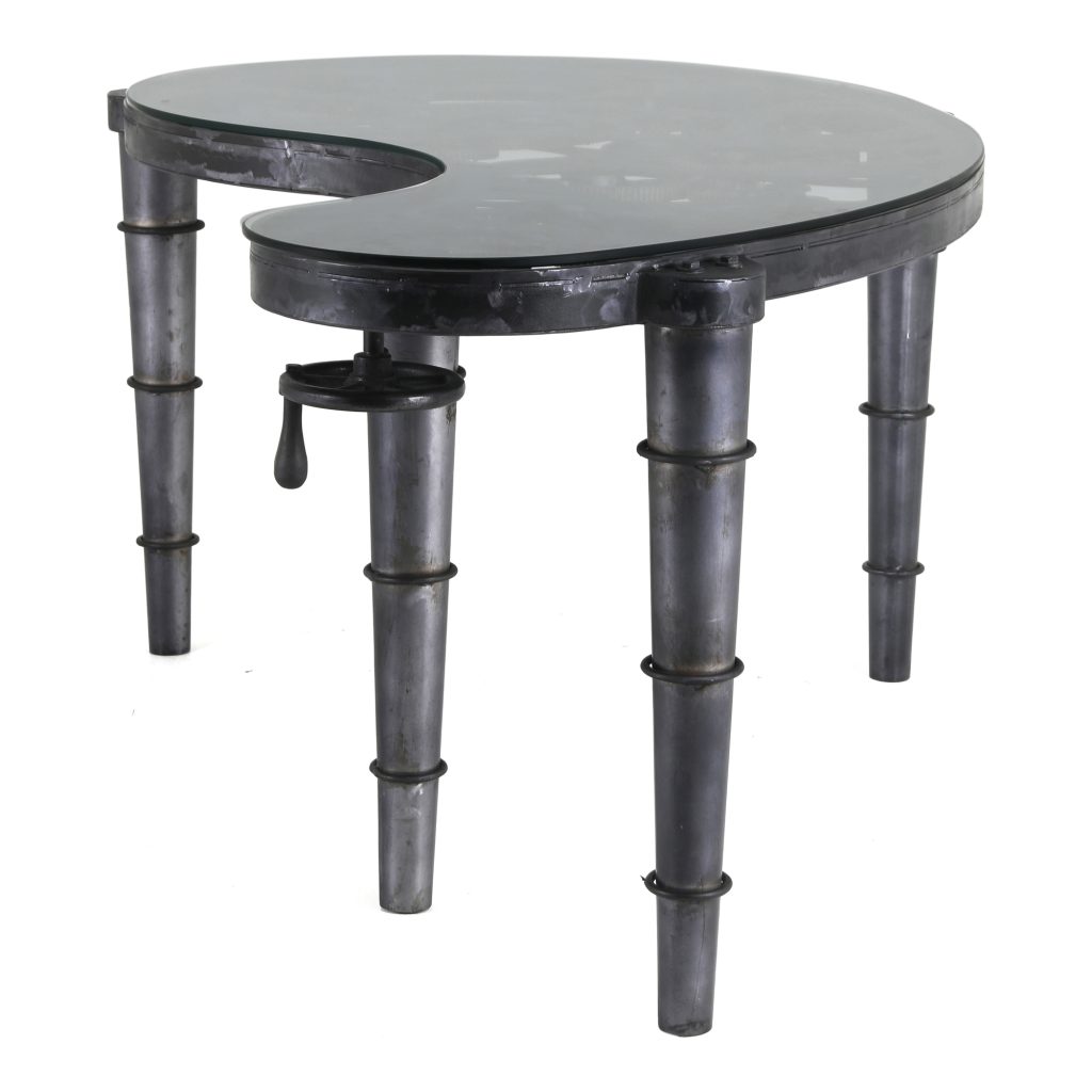 A desk that twists a classic industrial look for your modern home office design. The Shifting Gears desk presents an all-iron construction and heavy-duty tempered glass top. With mechanical legs and a curved shape, this desk means business.
