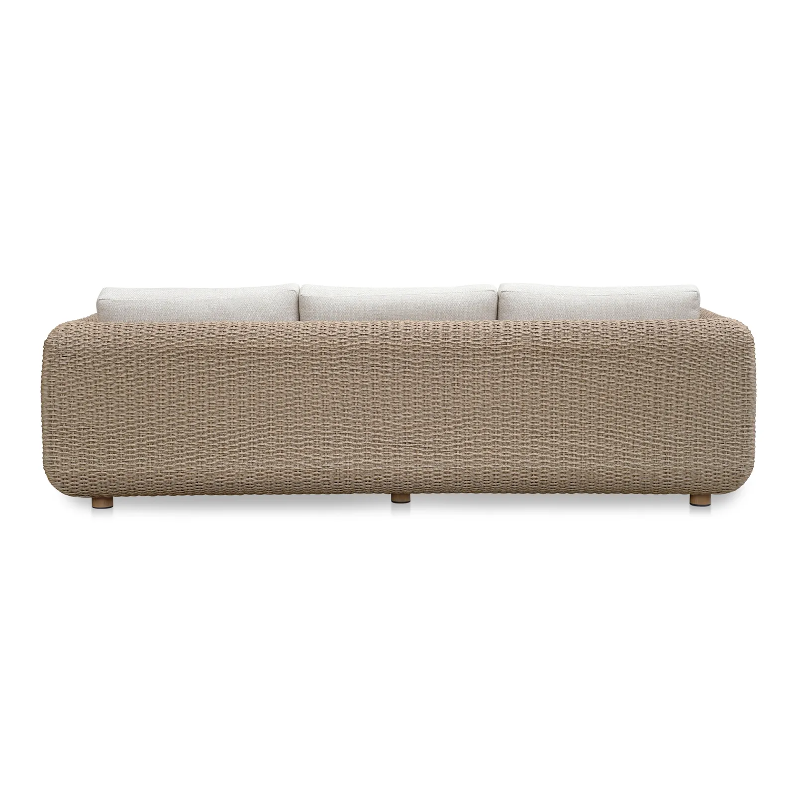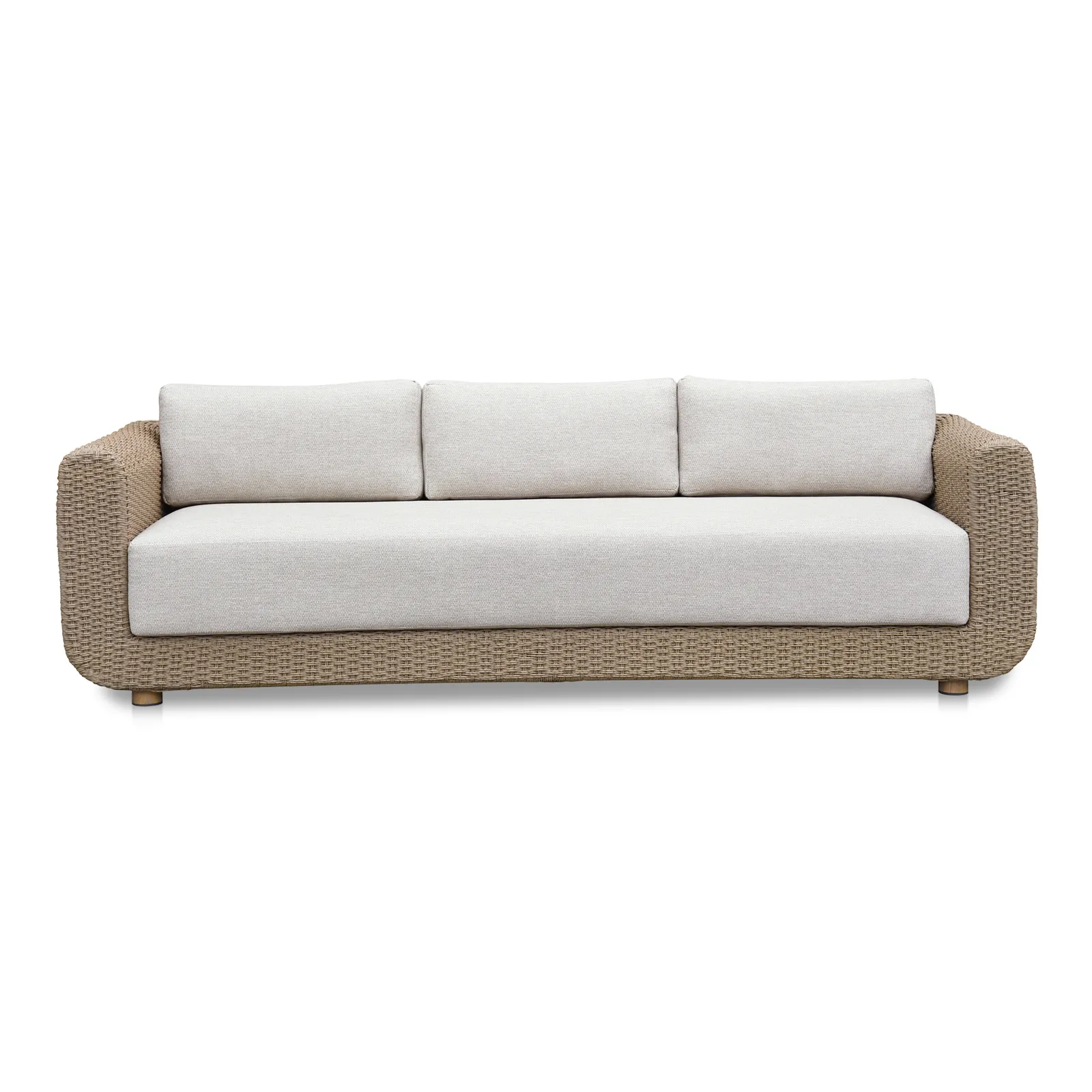 The Soma outdoor sofa finds a graceful interplay of form and purpose. Its natural finished PE synthetic wicker frame and sunproof, heathered Olefin fabric cushions exude poise and durability. Curved, playful arms and quick-dry foam invite relaxation while ensuring timeless panache.