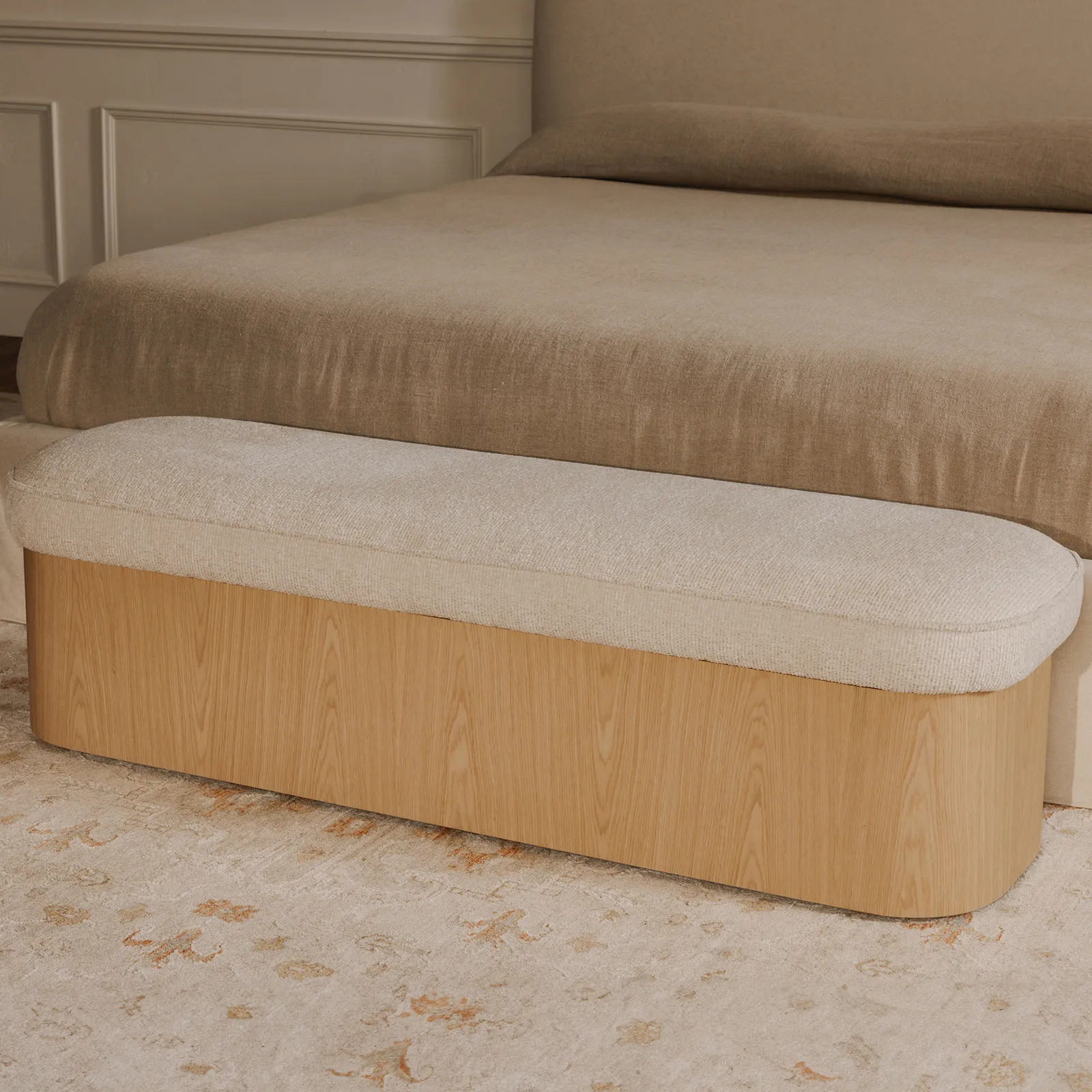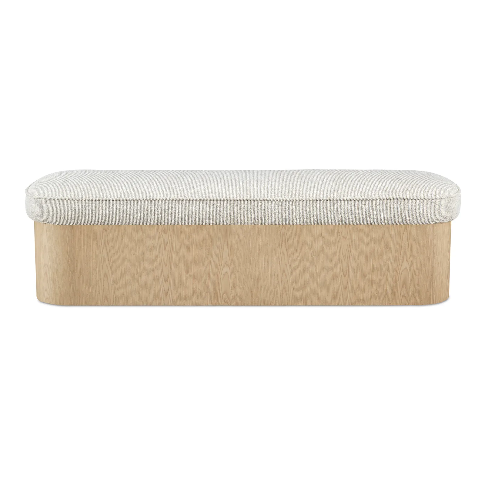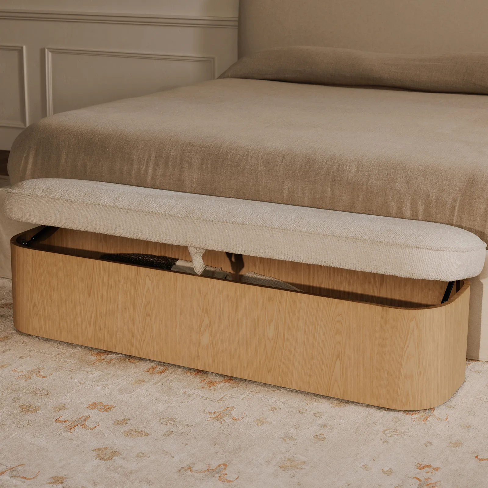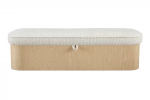 The Sonny bench elegantly articulates the luxury of simplicity with an ash veneer base and a hydraulic lift top that unveils discreet storage. Upholstered in flecked oatmeal fabric, the plush seat contrasts the wood’s solid nature with piping that traces its contours. Curved corners soften the bench’s silhouette, creating a serene yet functional piece.