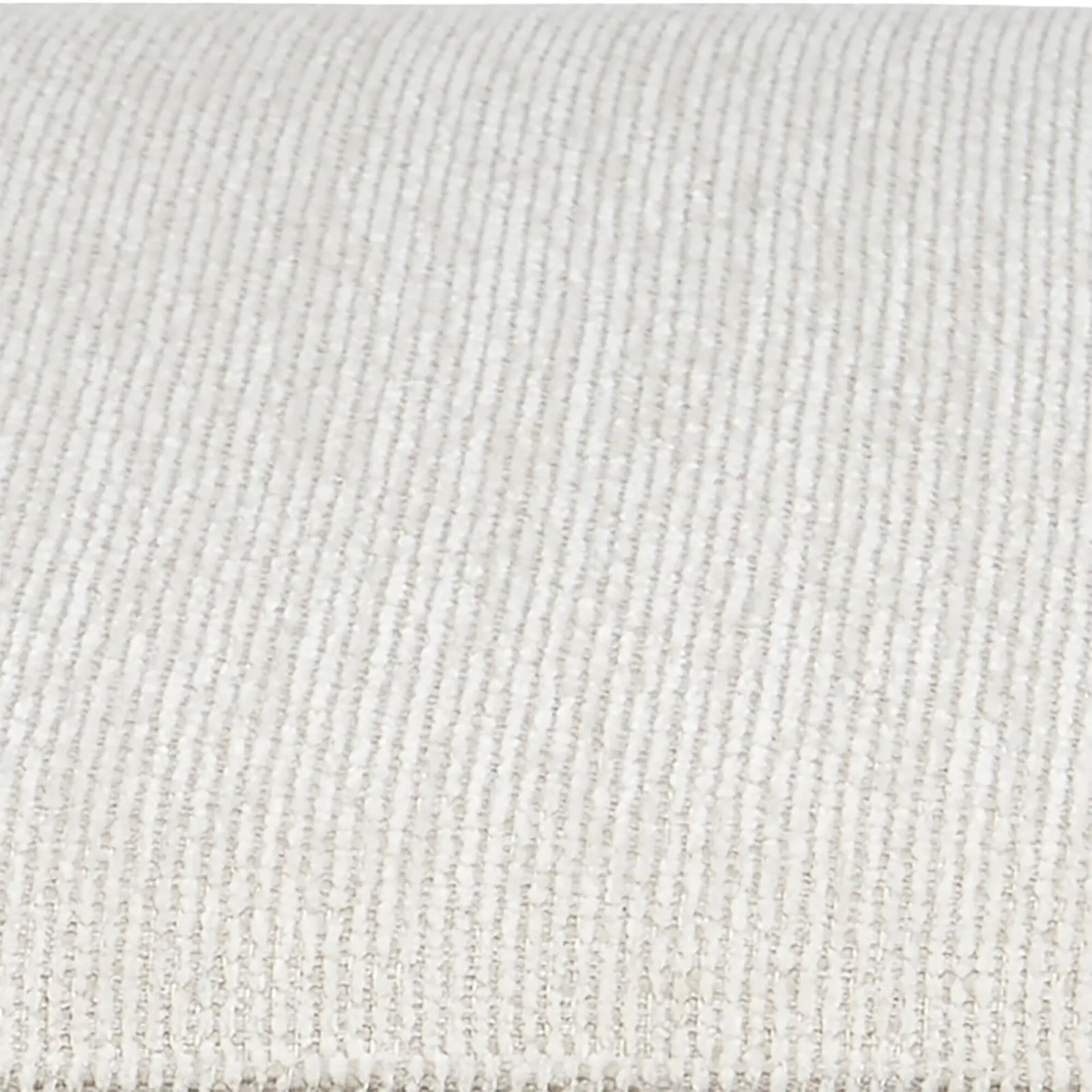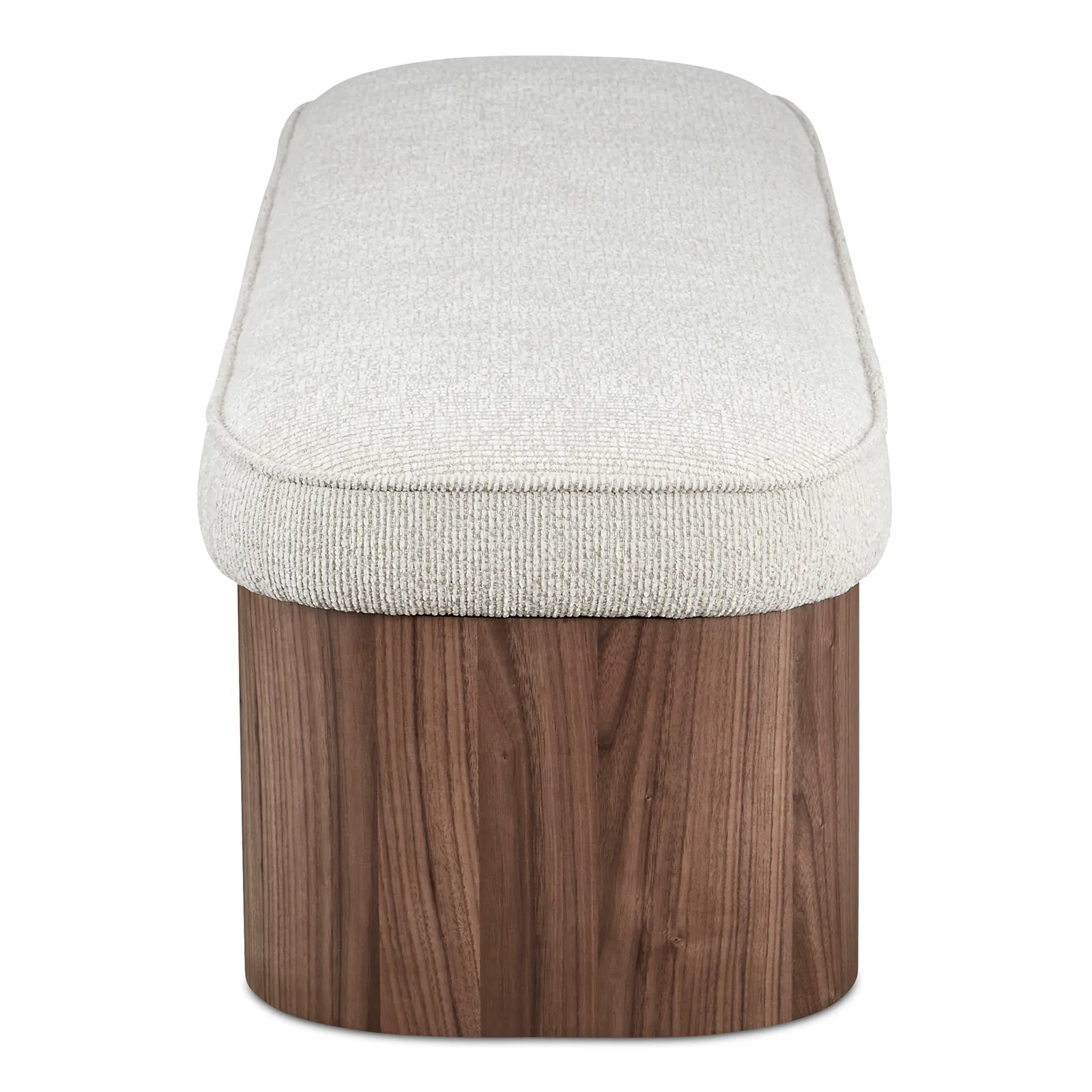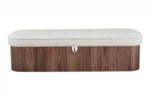 The Sonny bench elegantly articulates the luxury of simplicity with a walnut veneer base and a hydraulic lift top that unveils discreet storage. Upholstered in flecked oatmeal fabric, the plush seat contrasts the wood’s solid nature with piping that traces its contours. Curved corners soften the bench’s silhouette, creating a serene yet functional piece.