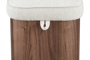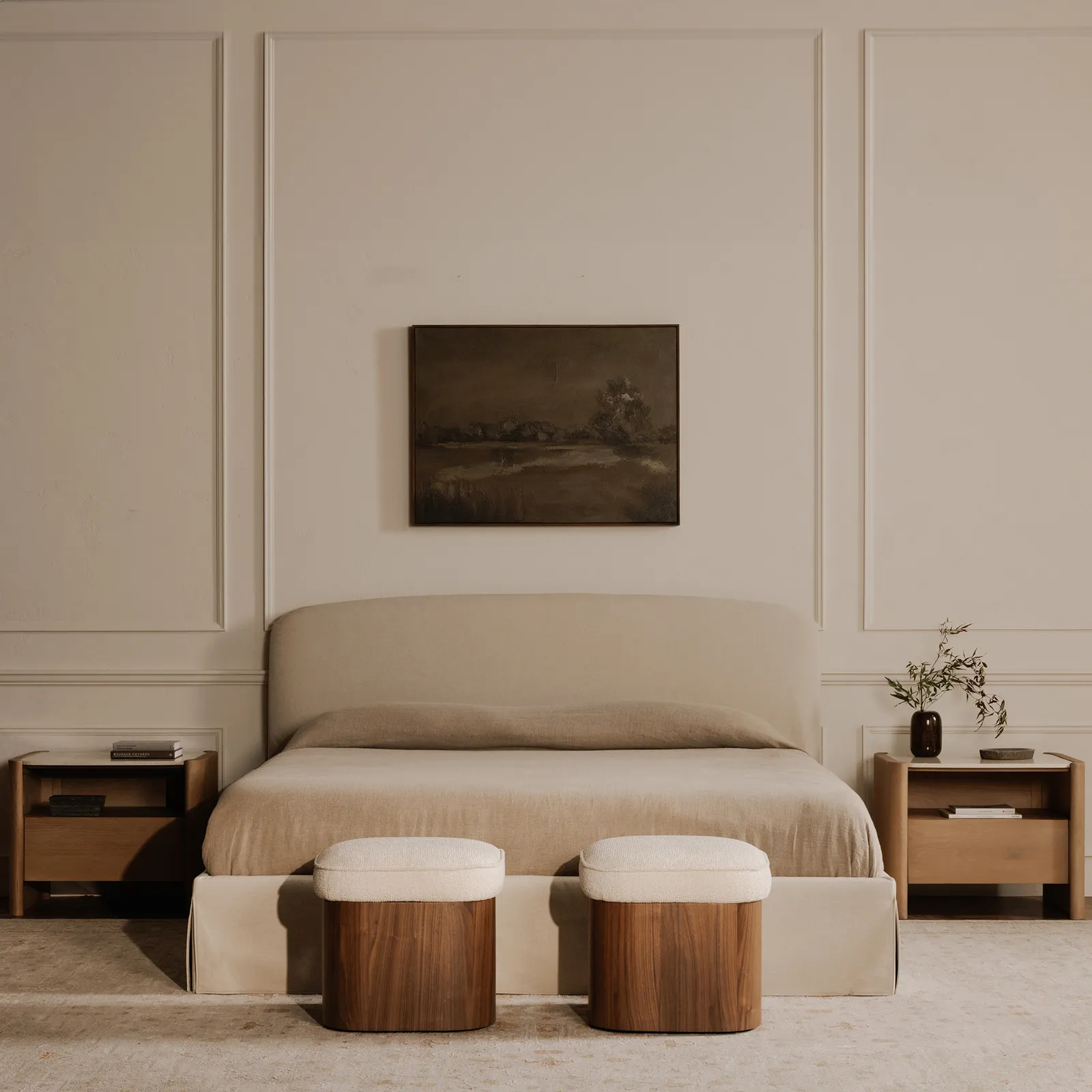 The Sonny stool elegantly articulates the luxury of simplicity with a walnut veneer base and a lift top that unveils discreet storage. Upholstered in flecked oatmeal fabric, the plush seat contrasts the wood’s solid nature with piping that traces its contours. Curved corners soften the stool’s silhouette, creating a serene yet functional piece.