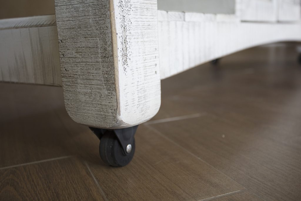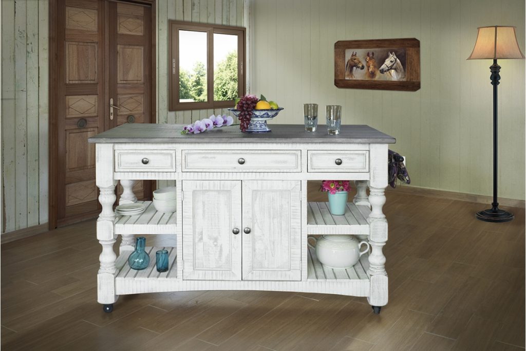 • Exuding farmhouse chic with just the right touch of old-world charm, the Stone Collection is meticulously crafted from solid pine wood. The wood is lightly distressed, showcasing a white finish and complemented by weathered gray tops.