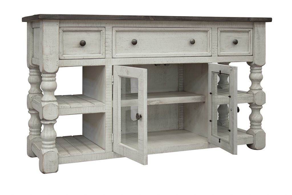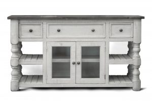• Exuding farmhouse chic with just the right touch of old-world charm, the Stone Collection is meticulously crafted from solid pine wood. The wood is lightly distressed, showcasing a white finish and complemented by weathered gray tops.