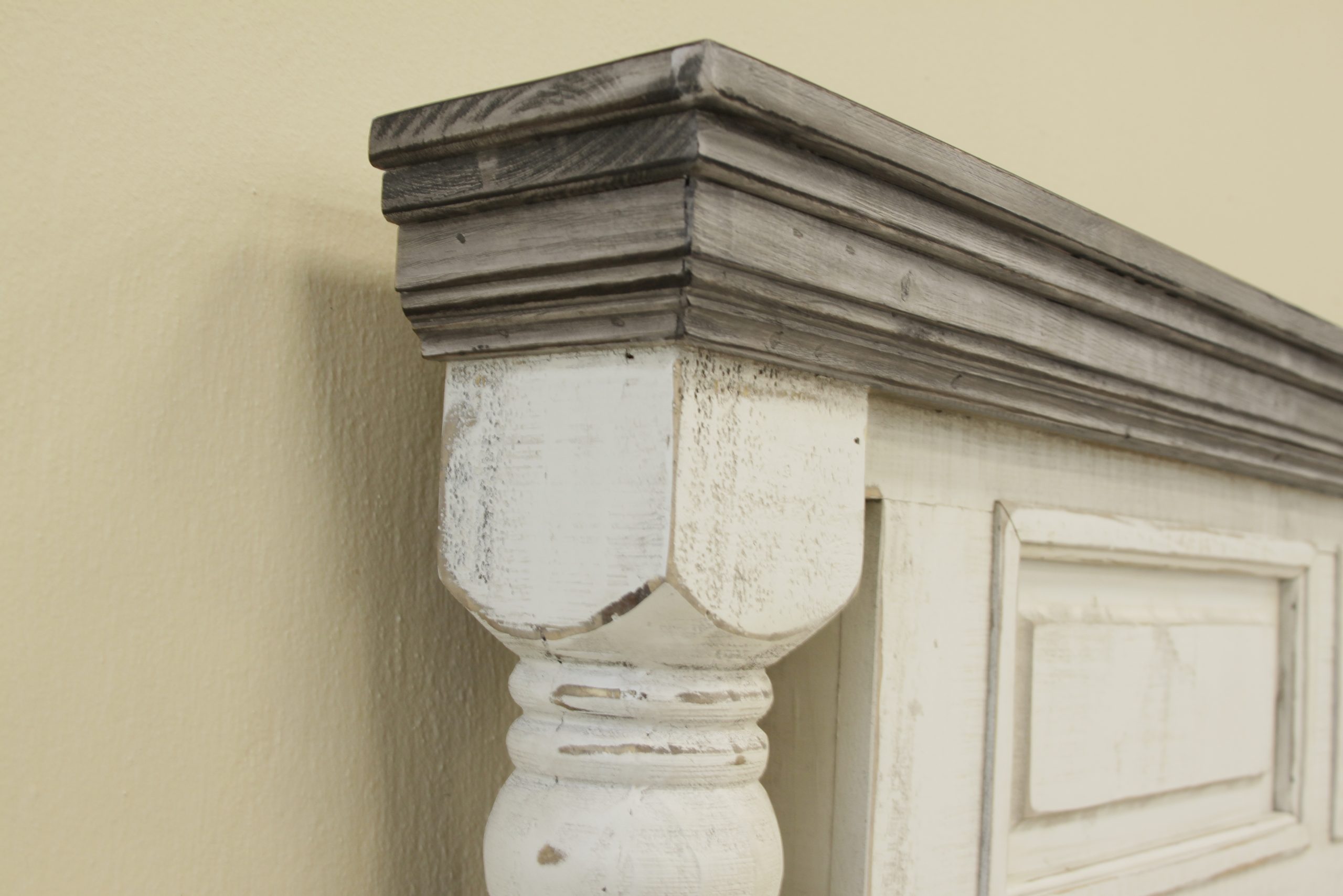 • Two-tone, multi-step lacquer finish. The top features a weathered gray finish on hand-distressed wood, while the rest of the case has an eggshell antiqued finish.