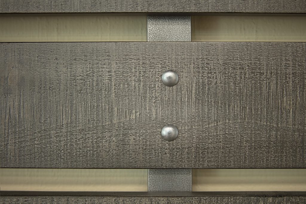 • Two tone, multi-step lacquer finish. Top features weathered gray finish on hand-distressed wood. Eggshell antiqued finish on the case