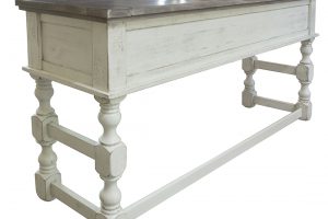 • Exuding farmhouse chic with just the right touch of old-world charm, the Stone Collection is meticulously crafted from solid pine wood. The wood is lightly distressed, showcasing a white finish and complemented by weathered gray tops.