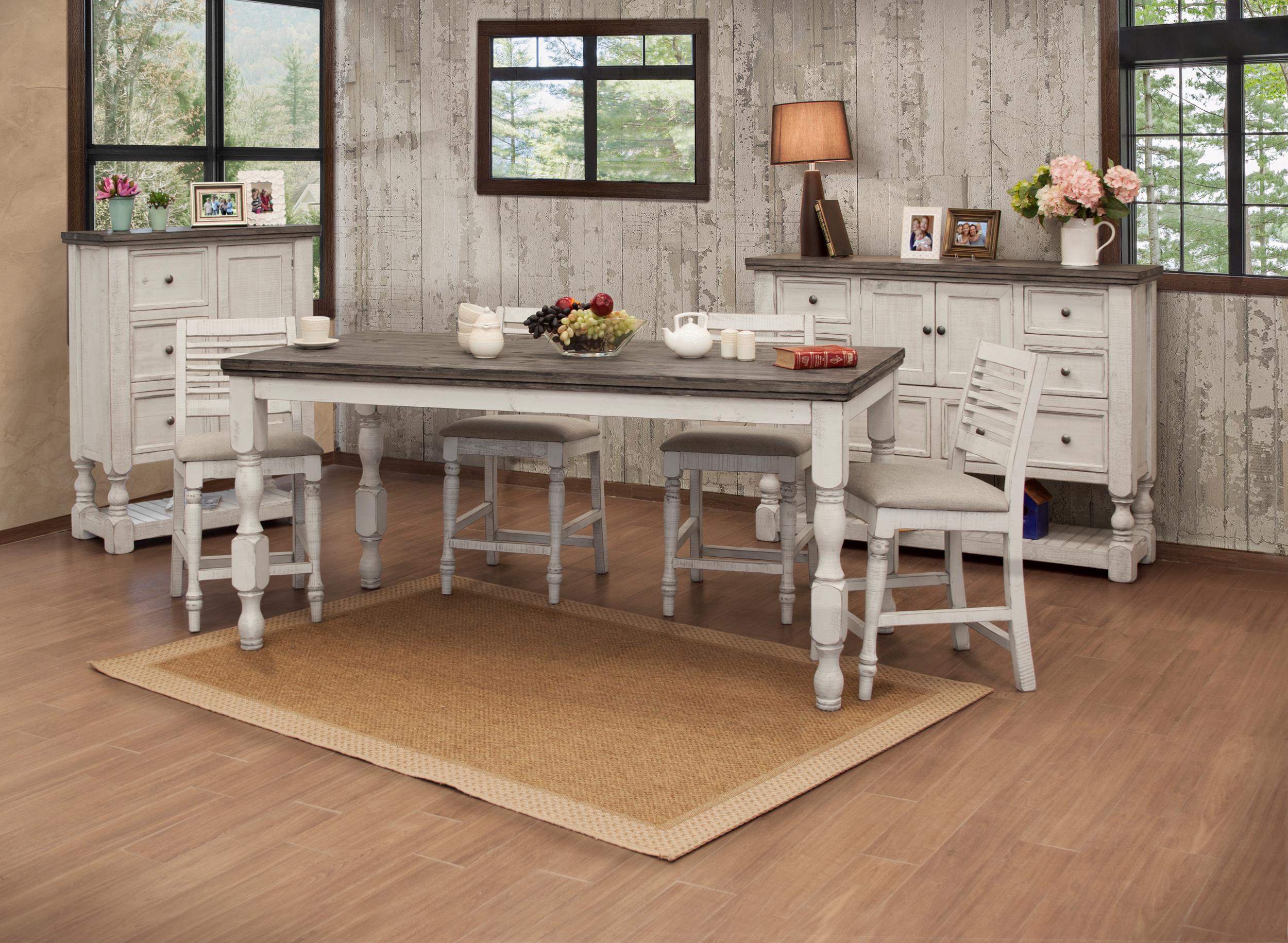 • Exuding farmhouse chic with just the right touch of old-world charm, the Stone Collection is meticulously crafted from solid pine wood. The wood is lightly distressed, showcasing a white finish and complemented by weathered gray tops.