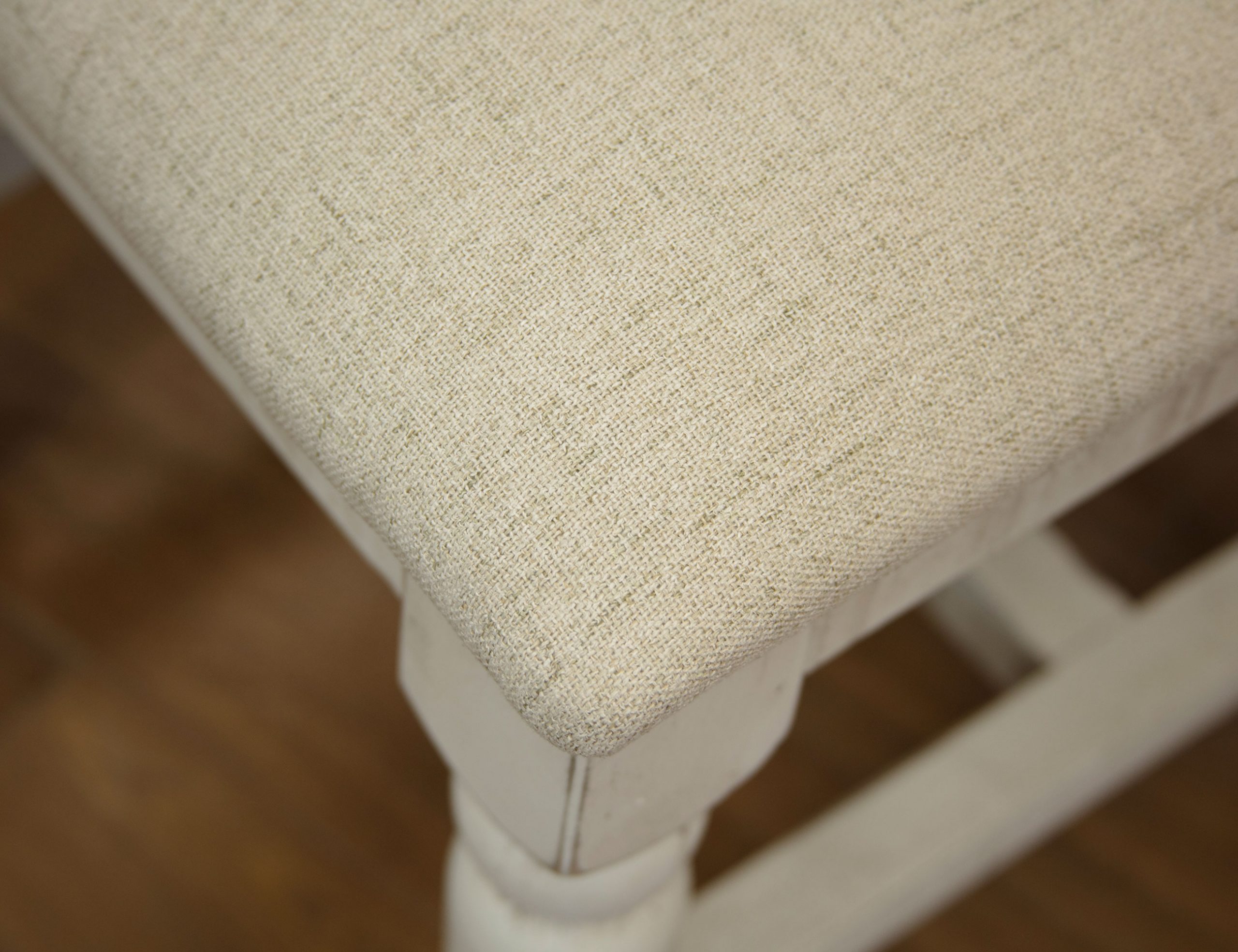 • The Stone stool showcases a sturdy pine wood frame and an upholstered padded seat in elegant grey fabric. Finished in our signature ivory color, the wooden frame adds a touch of sophistication to this versatile piece.