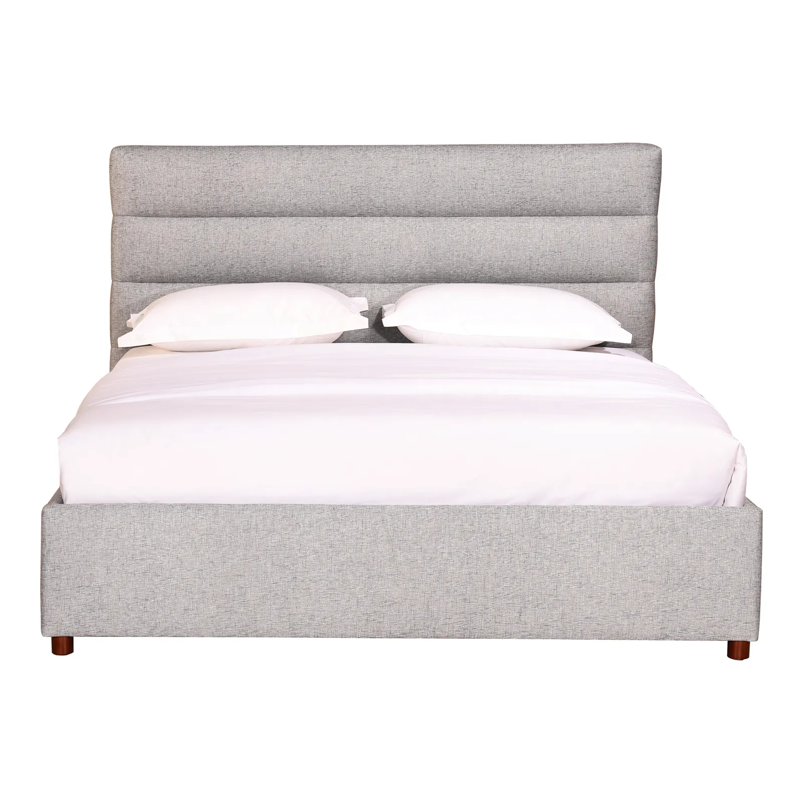 - Soft, polyester upholstery with foam padded, channeled headboard. Subtle wooden, cylinder shaped legs