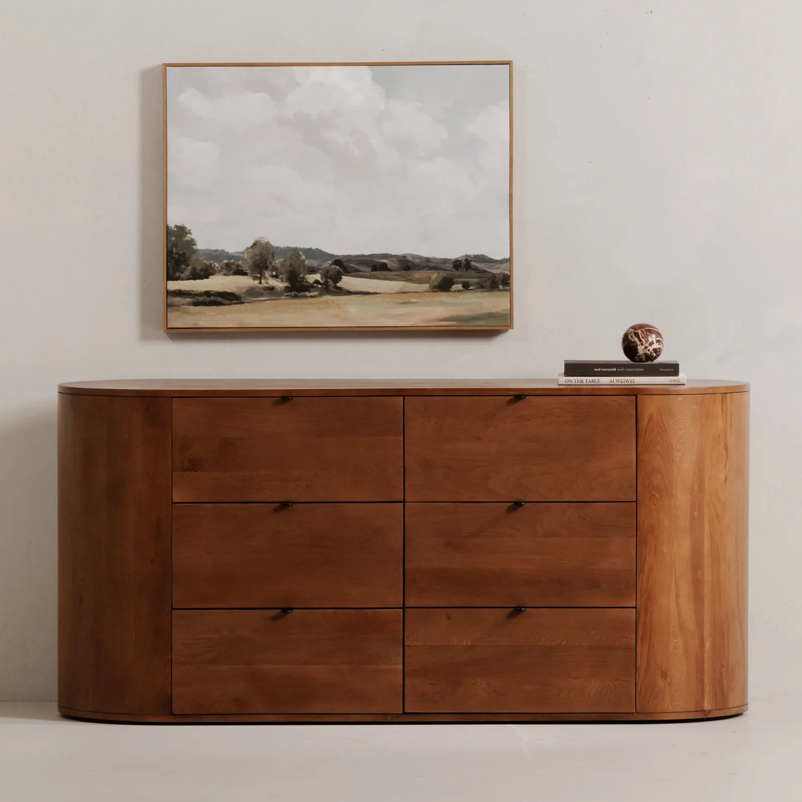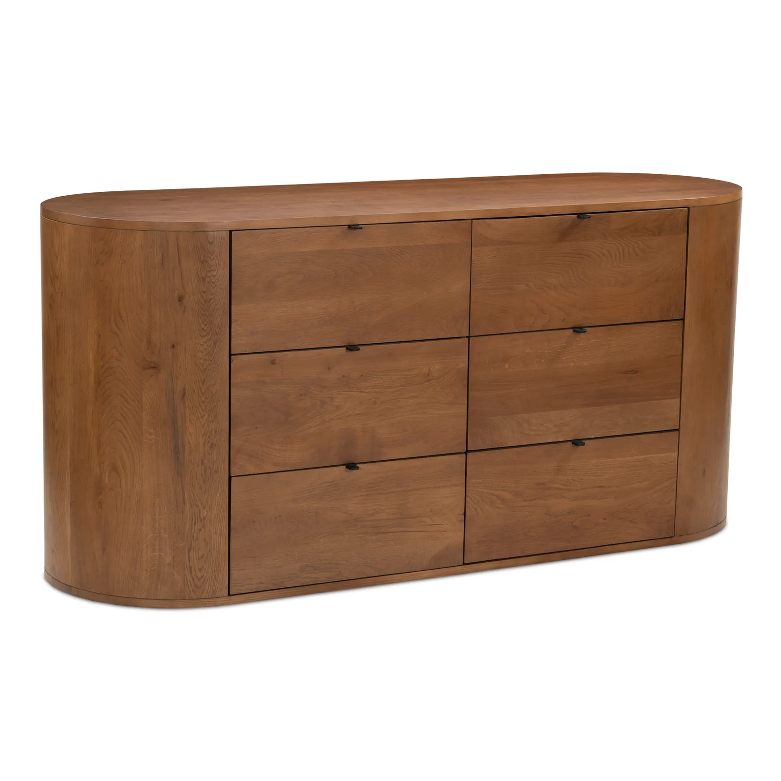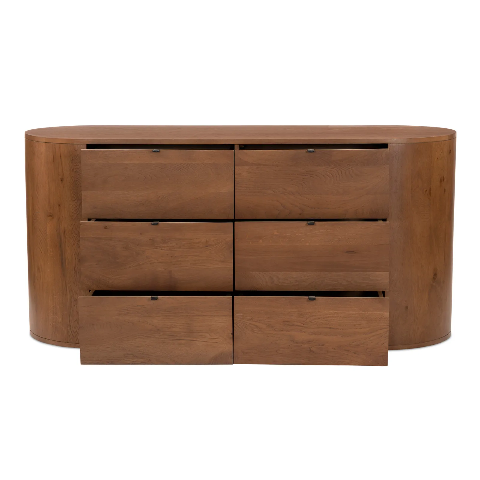 No sharp corners here. The Theo dresser’s rounded silhouette and rich oak finish bring a softer, more organic feel to bedroom storage. With six roomy drawers, soft-close glides, and subtle pull tabs, it’s a study in modern minimalism that still gets things done. Crafted from solid oak with oak veneer backing, each piece shows off unique wood grain character. Natural beauty, functional design—Theo’s got range.