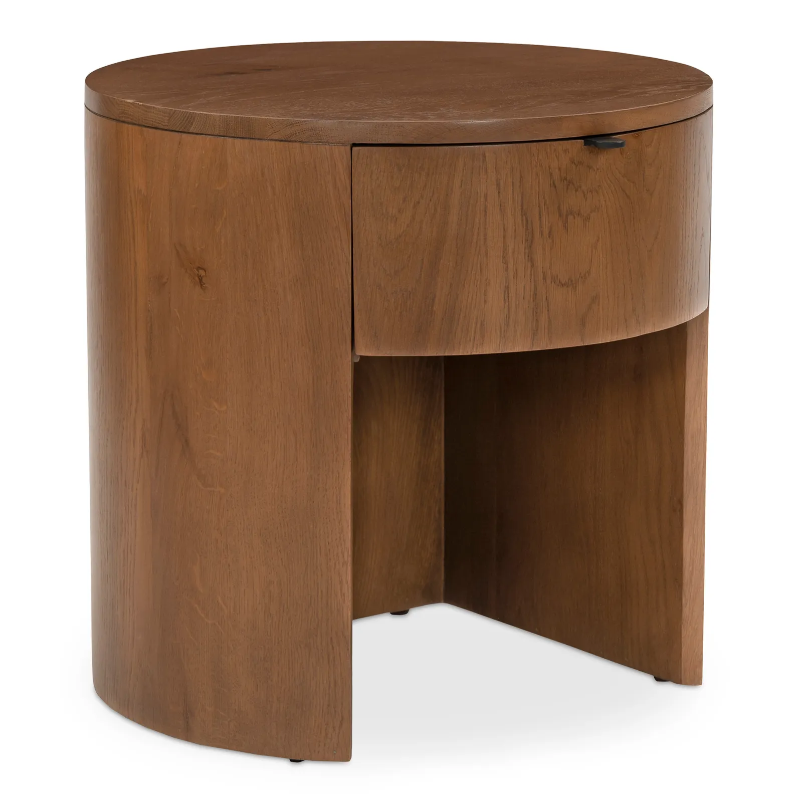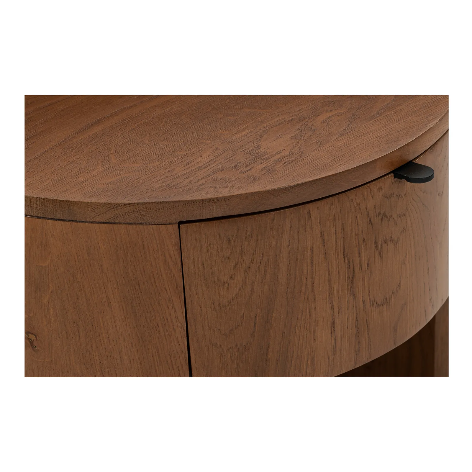 Curved and functional—just how we like it. The Theo One Drawer Nightstand features a clean, rounded silhouette in solid oak with a warm brown finish. Its minimalist form brings soft geometry to modern bedrooms, while the natural wood grain and variation make each piece distinct. A single felt-lined drawer opens on soft-close glides and includes a built-in safety stop. Streamlined, sculptural, and made for everyday function.