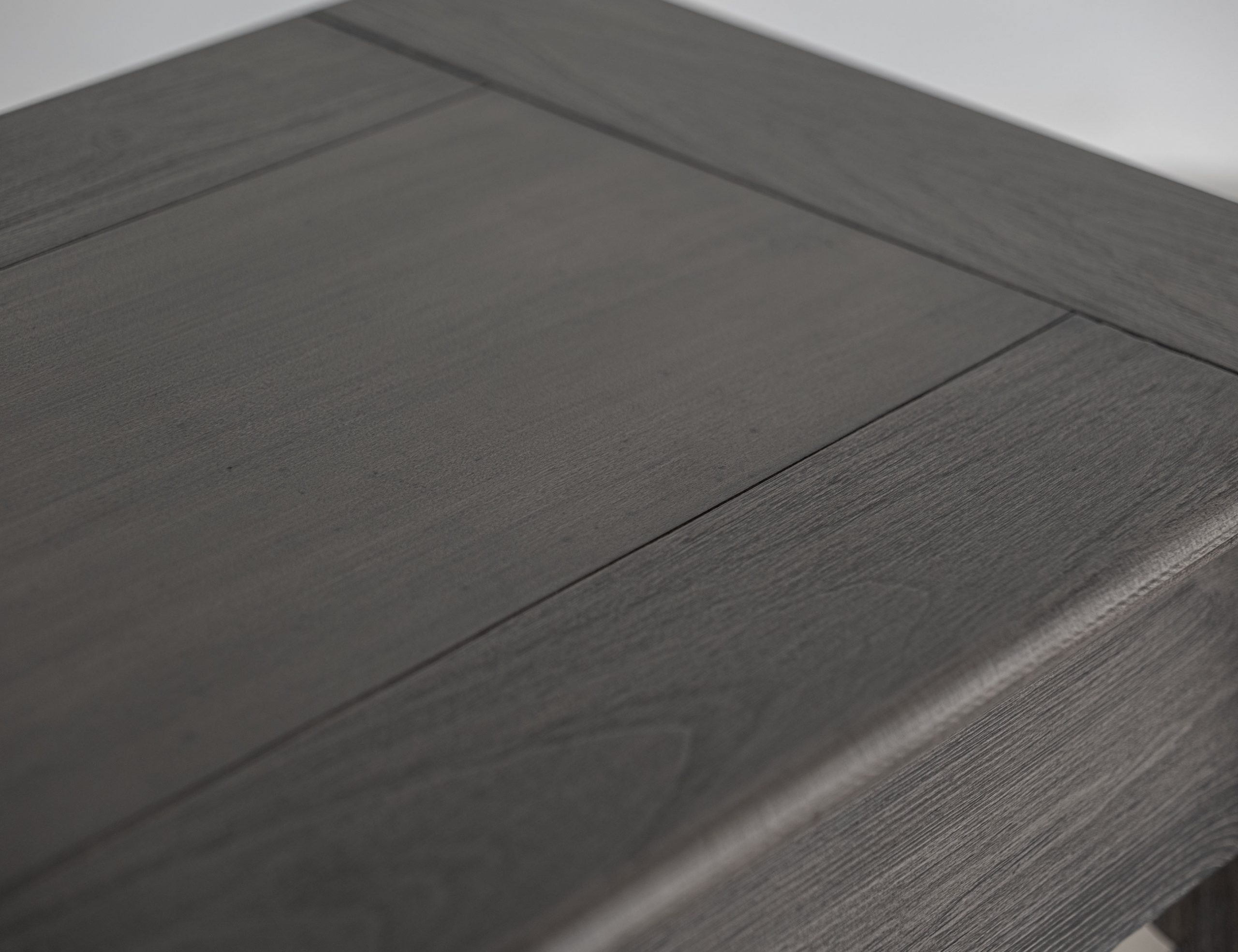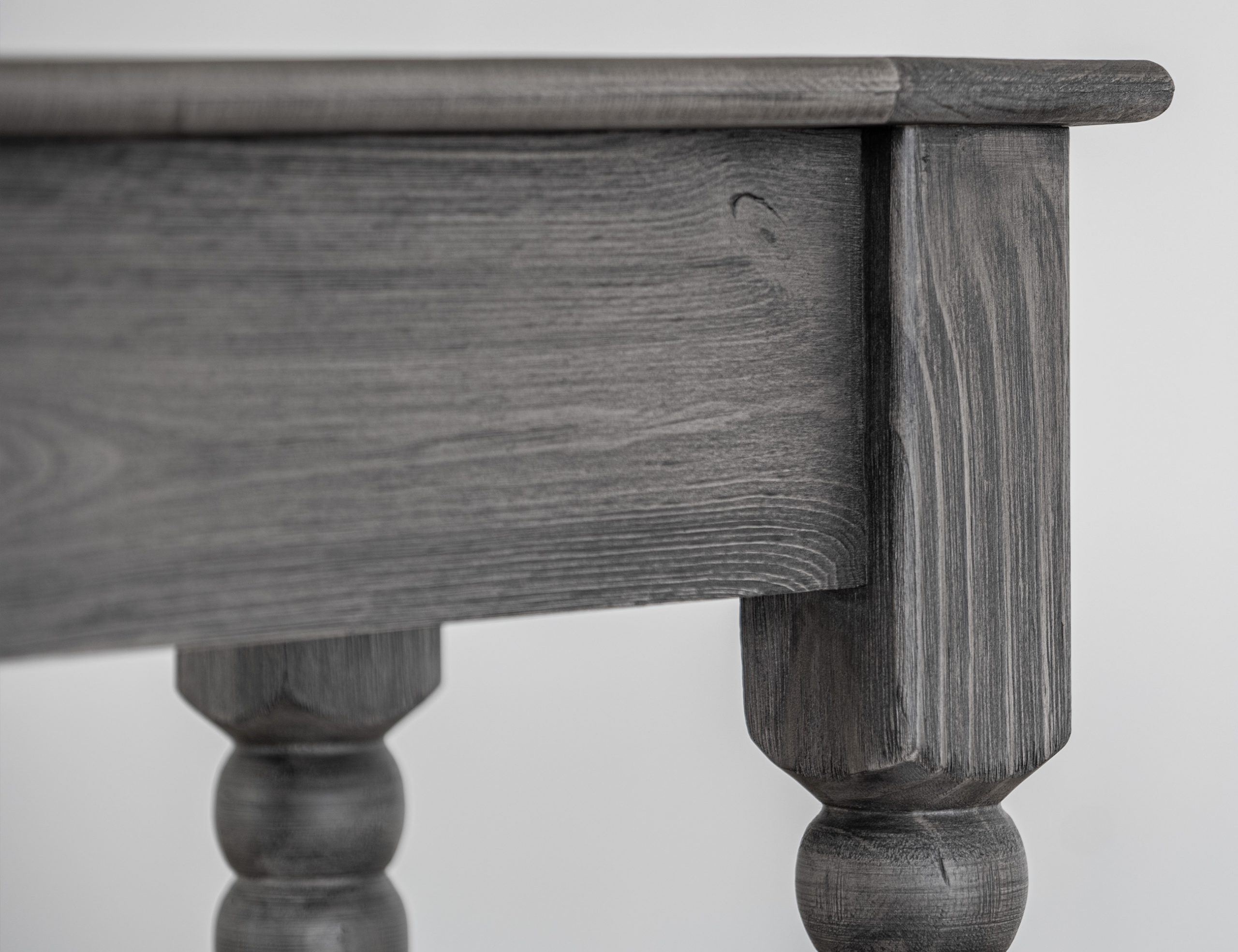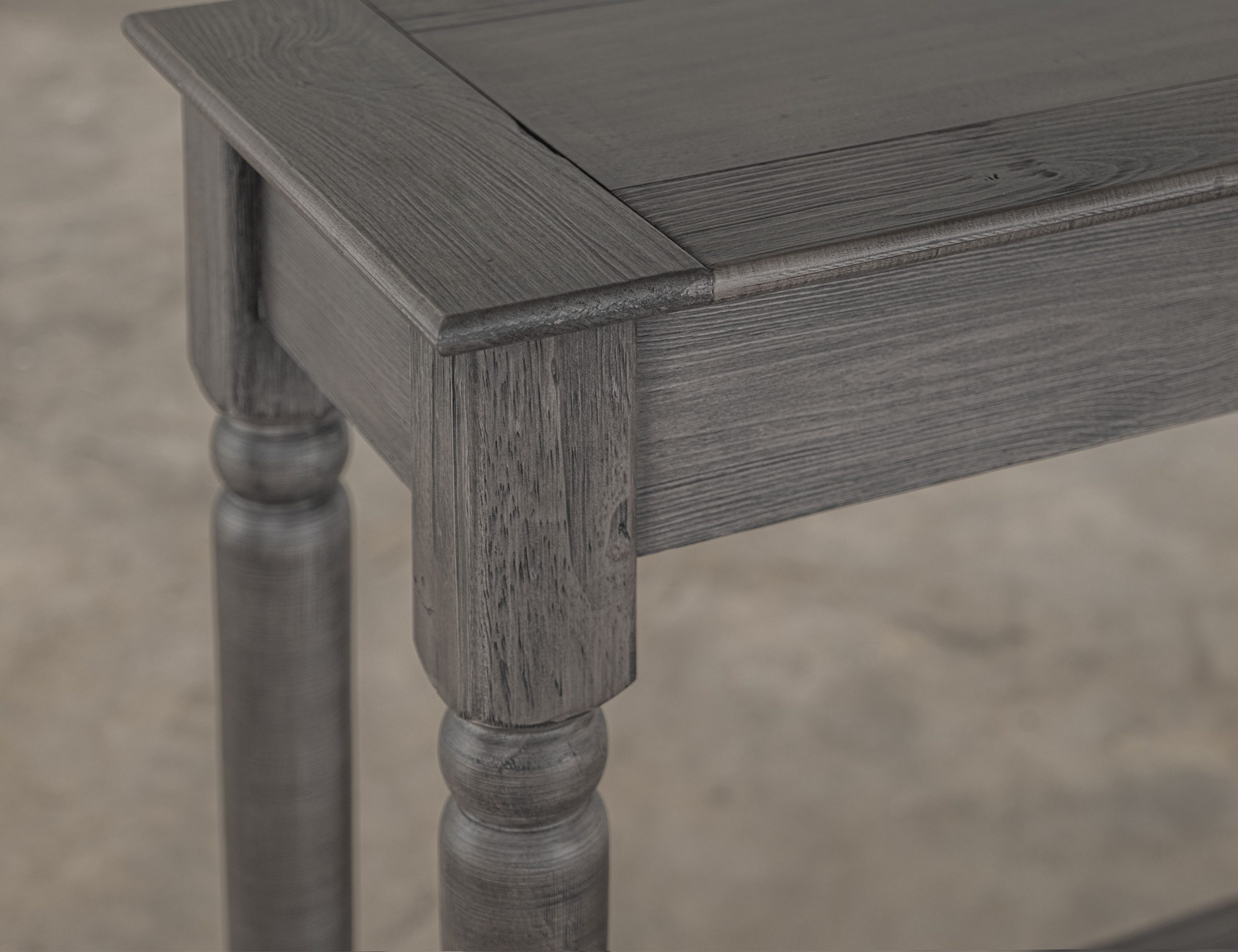 • The finish is achieved through wire-brushed wood and a multi-step lacquer process in a charred log tone with light brown tops.