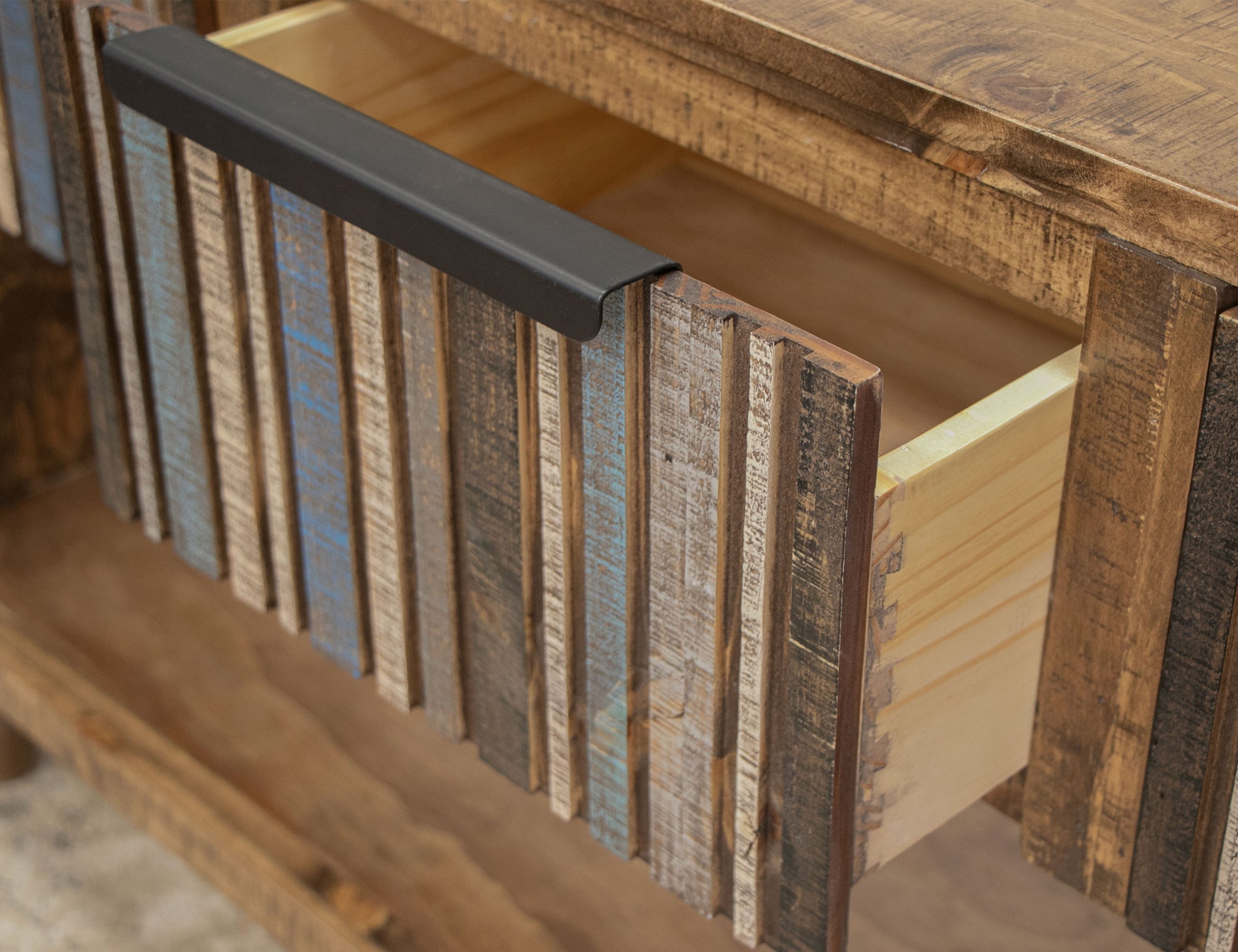 • The Tiza Console effortlessly combines timeless elegance with a clean-lined design, presenting a simple yet sophisticated silhouette. Crafted from the finest grade pine, it offers exceptional quality and outstanding value. This console boasts a soft, multicolored hand-distressed surface with subtle blue highlights.