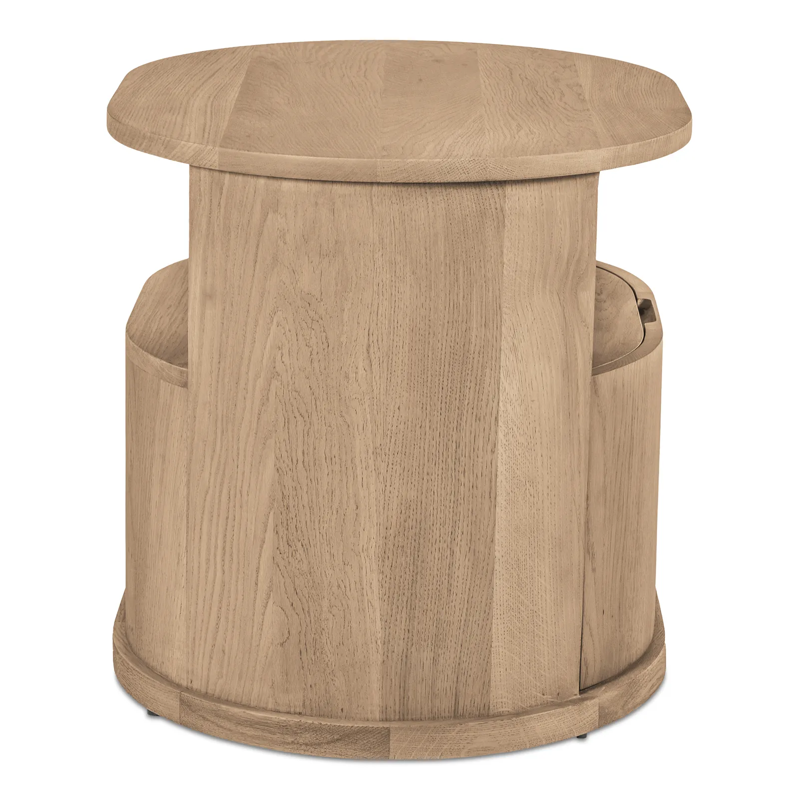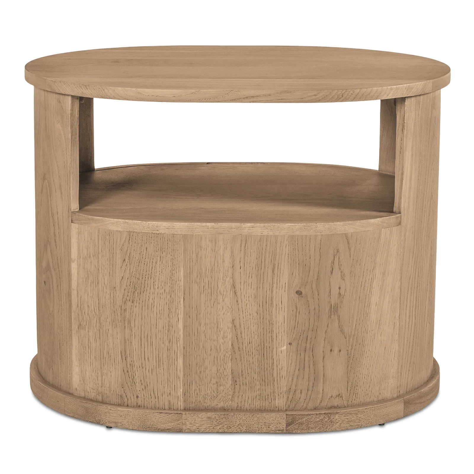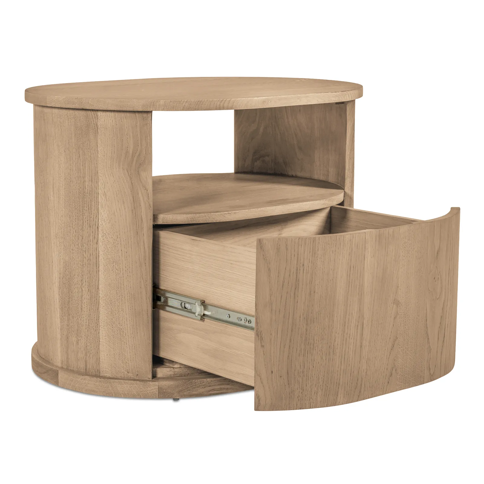 The Tommy nightstand embraces modern simplicity in a natural finish. Its distinctive racetrack capsule shape adds a contemporary touch to the bedroom, seamlessly blending form and function. This nightstand features a solid oak frame with oak veneer details, offering durability and refined style. The soft-close drawer and open shelf provide versatile storage options in a piece that speaks to modern appeal.