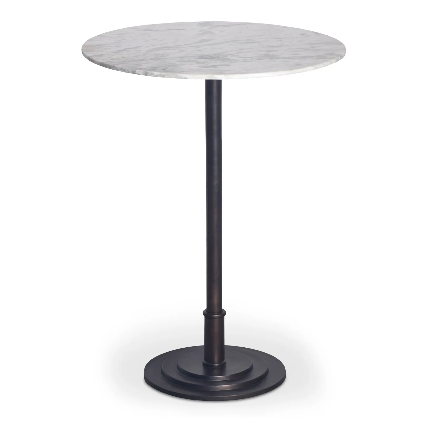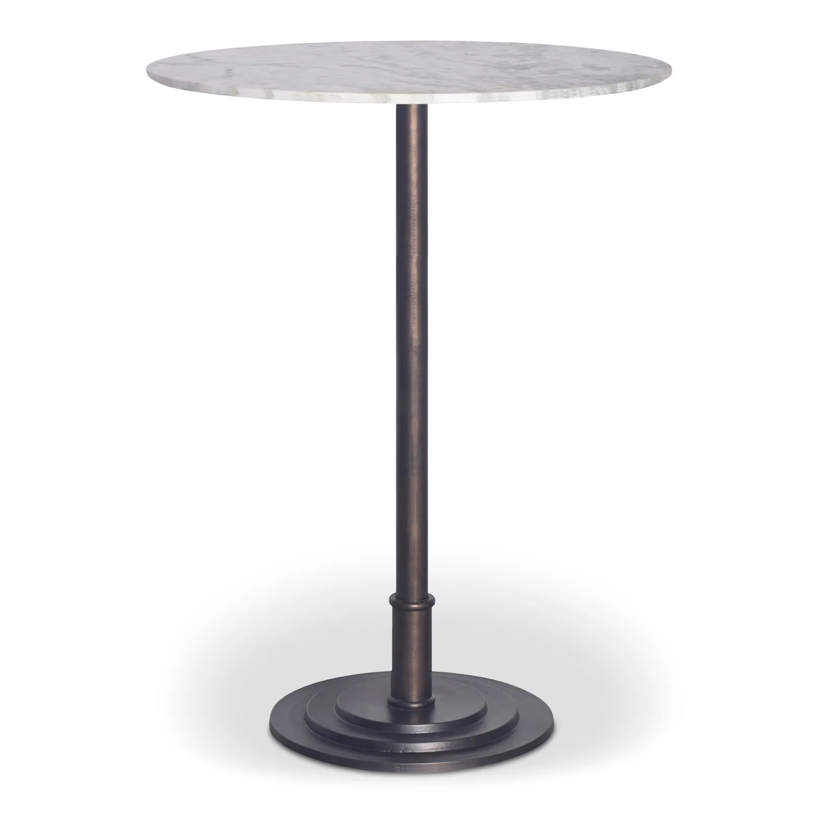 The Tori outdoor counter table creates a curated experience of lingering conversations and shared moments as unique white marble, with its natural veining, crowns a refined cast aluminum base. Three cascading circular tiers create an intriguing silhouette, while a cylindrical detail lightly punctuates this versatile outdoor safe piece.