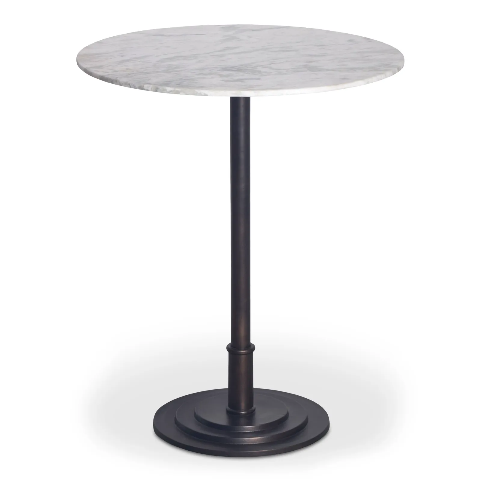 The Tori outdoor bar table creates a curated experience of lingering conversations and shared moments as unique white marble, with its natural veining, crowns a refined cast aluminum base. Three cascading circular tiers create an intriguing silhouette, while a cylindrical detail lightly punctuates this versatile outdoor safe piece.