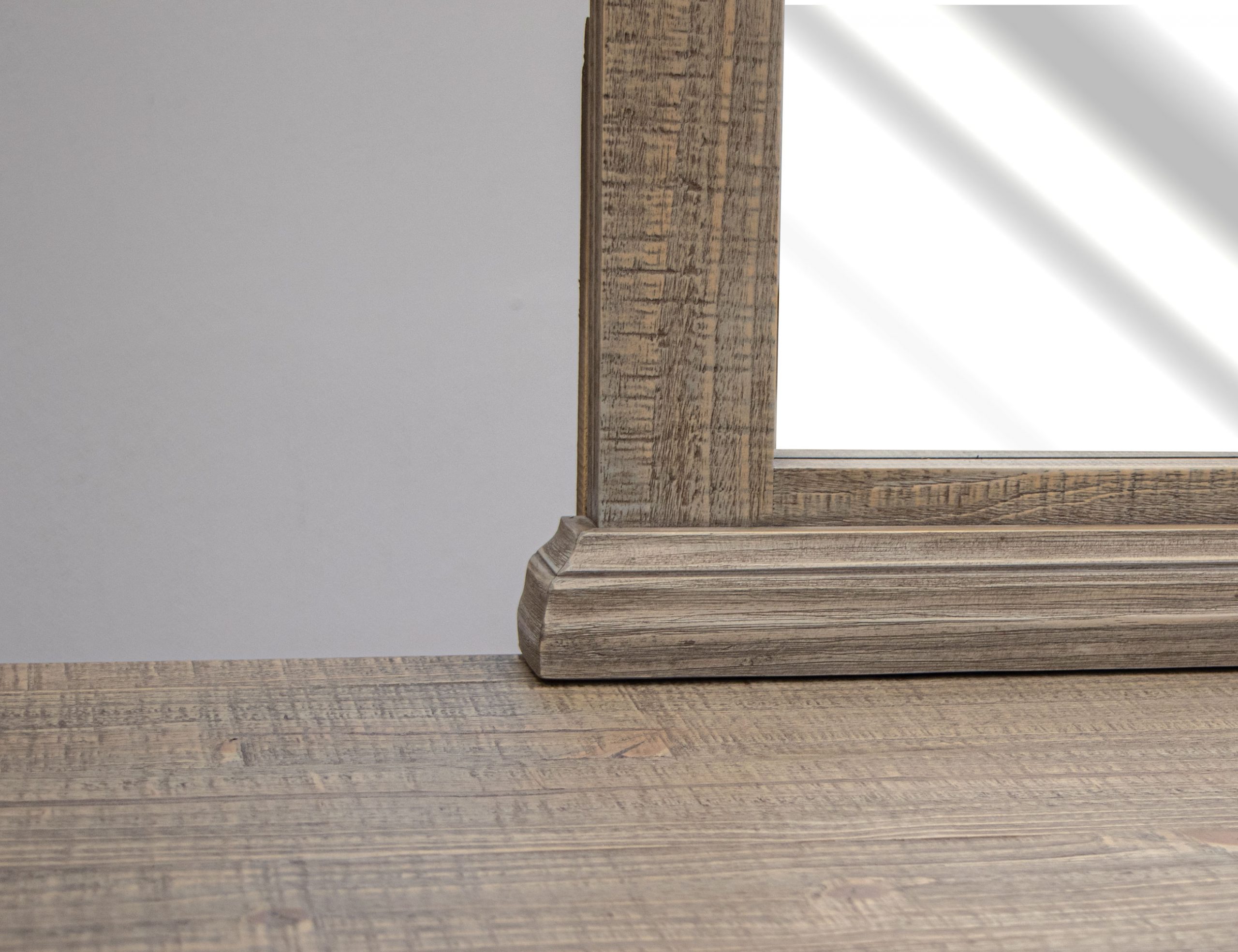 • Multi-step matte lacquer, wire-brushed wood, oyster gray finish.