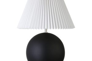 An exquisite embodiment of art deco elegance, the Tuve table lamp showcases a white pleated shade that is visually striking and skillfully crafted to diffuse light, creating a warm, inviting ambiance in any room. In contrast, a black polyresin base adds an air of understated luxury, seamlessly blending form and function.