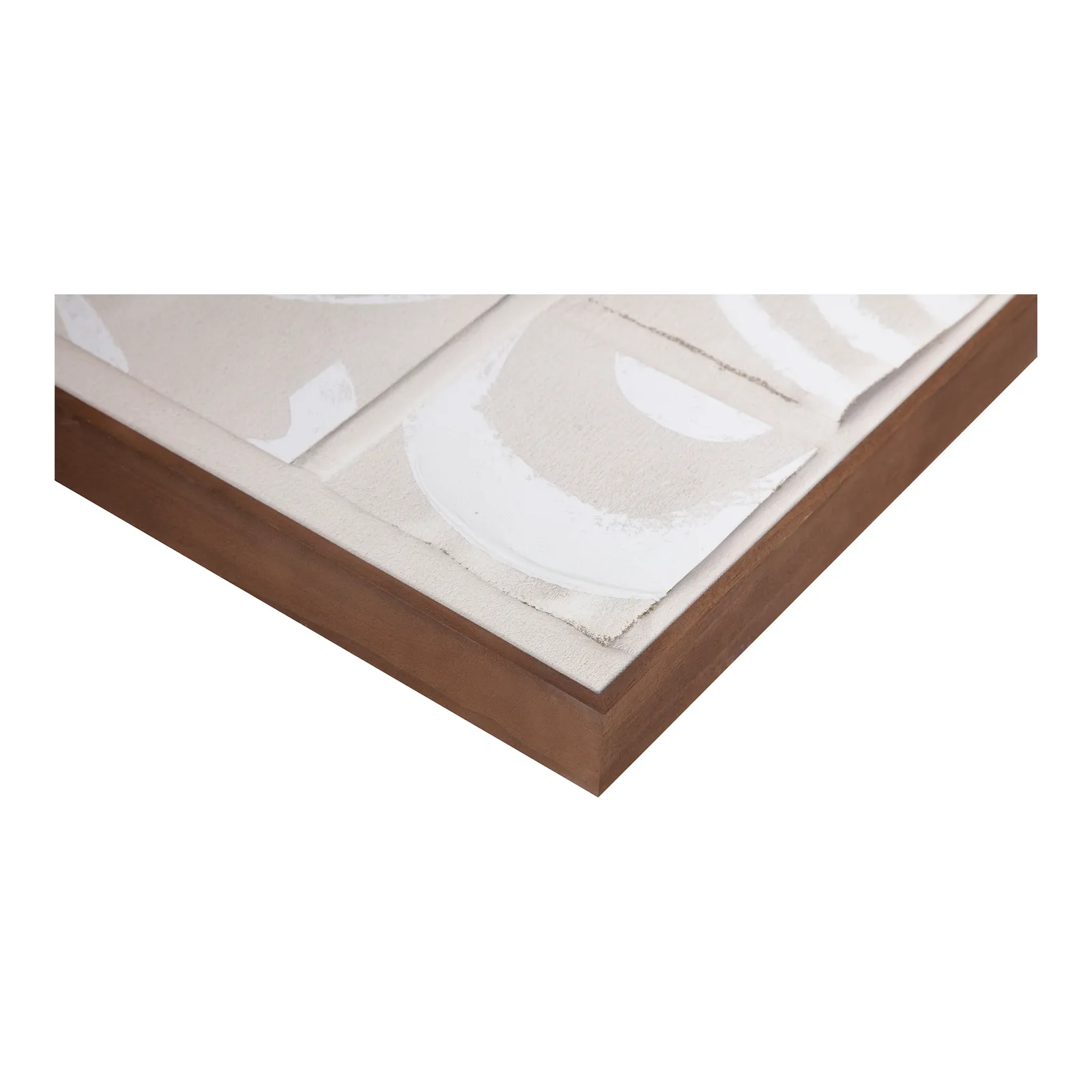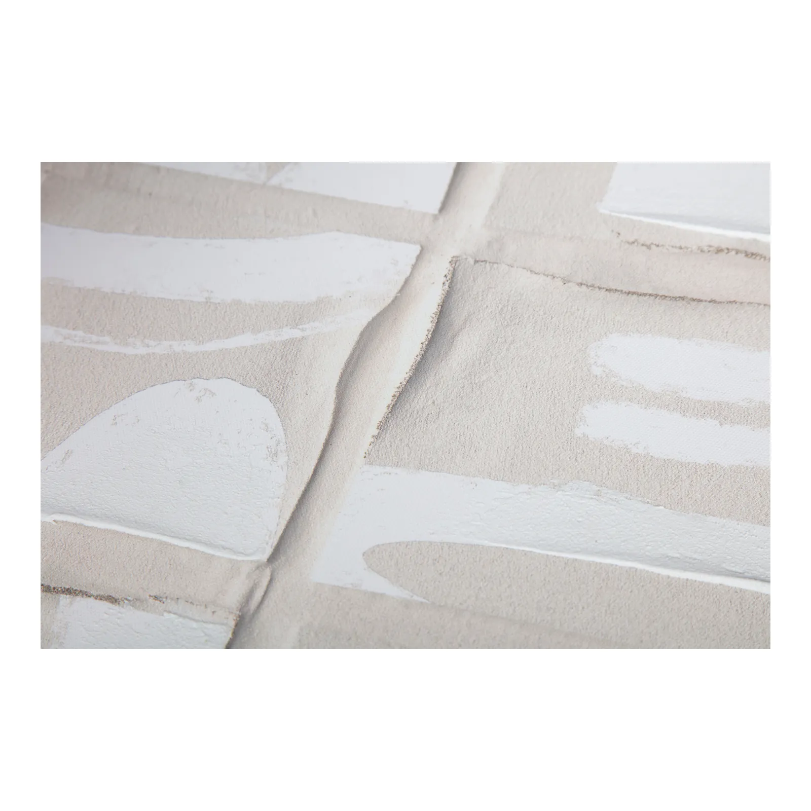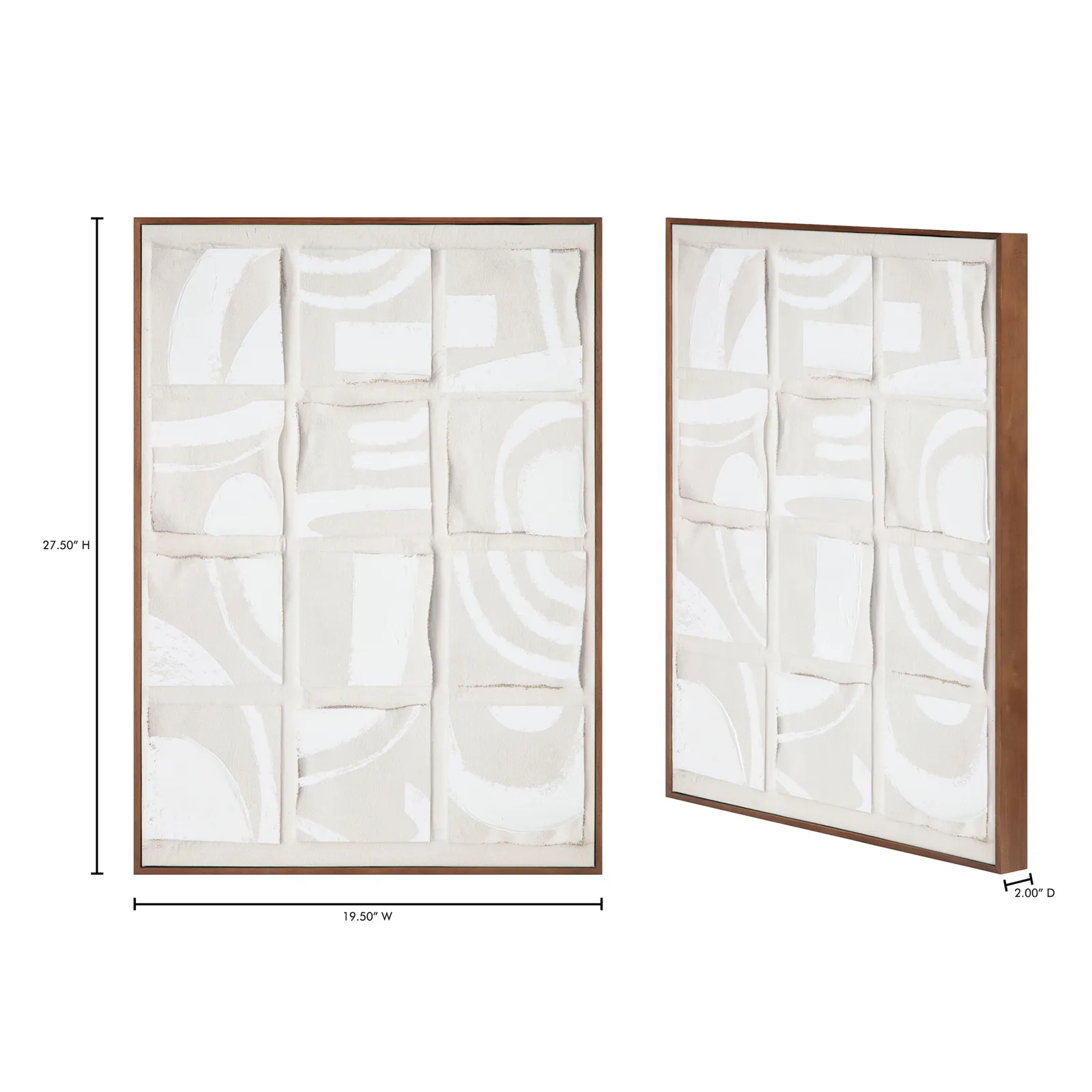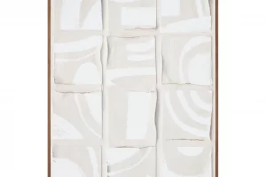 Inspired by the Dadaist movement and collage art, Unfold 2 is an homage to Ellsworth Kelly’s “Cité,” where ink strokes were brushed across a sheet of paper, cut into twenty squares, and randomly recomposed in a grid pattern. Shadowed tones add depth and dimension to the collage-like squares, while a neutral color palette and irregular shapes offer a softness to the sharp shapes—a remarkable abstract piece expertly finished with a solid pine frame.
