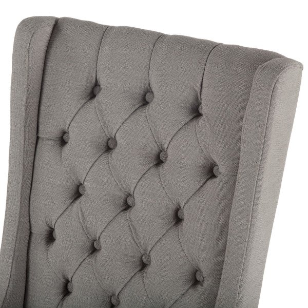 Breathe life into your dining room decor with this gorgeous upholstered dining chair. The Upholstered Seating collection of chairs adds comfort and casual elegance to any dining or kitchen area. Each chair in this collection boasts a solid hardwood frame upholstered in a linen, cotton and polyester blend fabric, with tufted seat back and wingback panels. This high back dining chair is upholstered in a beautiful gray fabric with classic, tufted button detailing along the seat back. The natural, light brown Napoleon finish of the solid wood legs complement a variety of wood and metal finishes, while providing a more traditional look. The pre-assembled dining chair is ready-to-use and of the finest quality, making it an effortless addition to any home.
