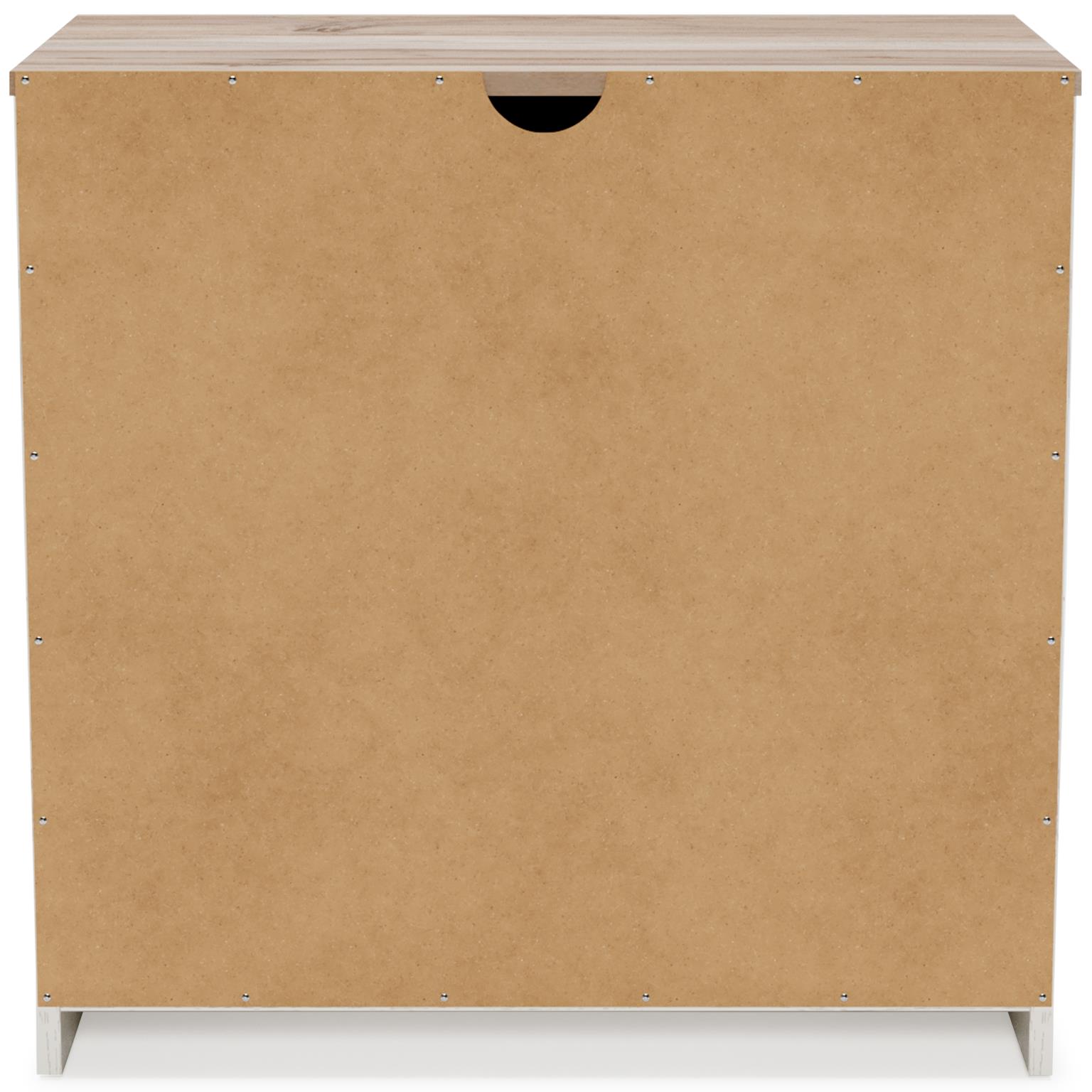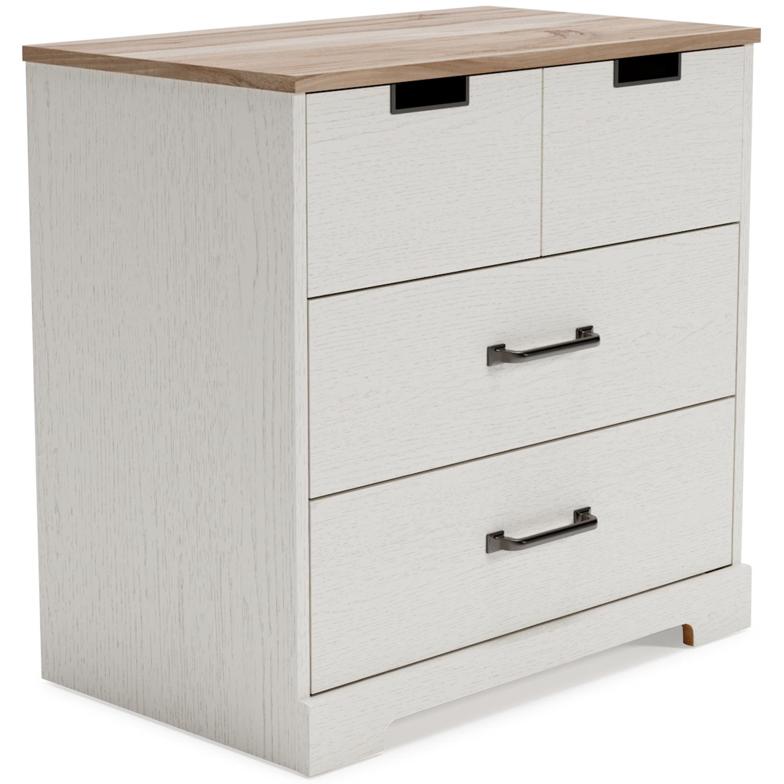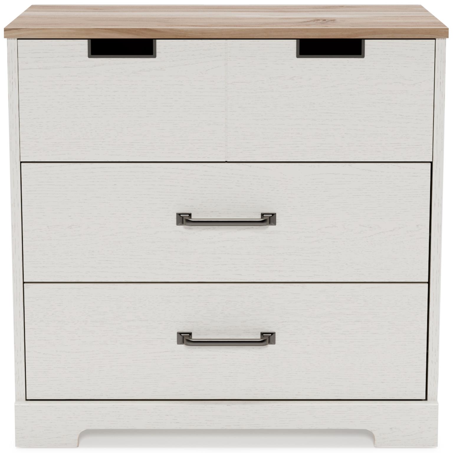 Fresh and inviting,,,, this chest is truly versatile. A crisp white painted finish with a subtle replicated wood grain brings light to your room,,,, while a warm brown finish accents the top. Design details include metal cut-out openings along the upper drawer,,,, with the lower drawers paired with metal handles in an antiqued nickel-tone finish. Three smooth-gliding drawers provide plenty of extra storage,,,, so there’s no excuse for a messy room.