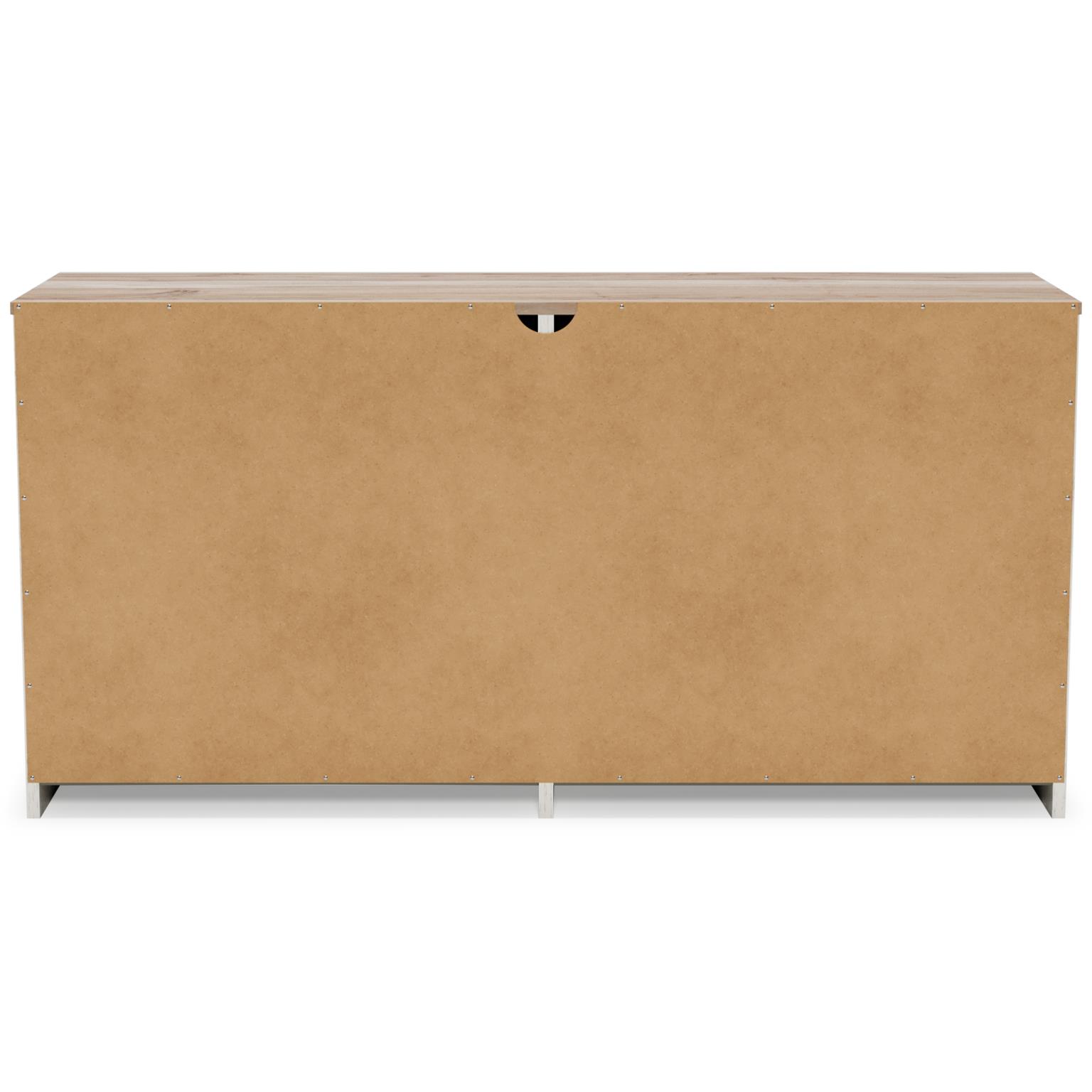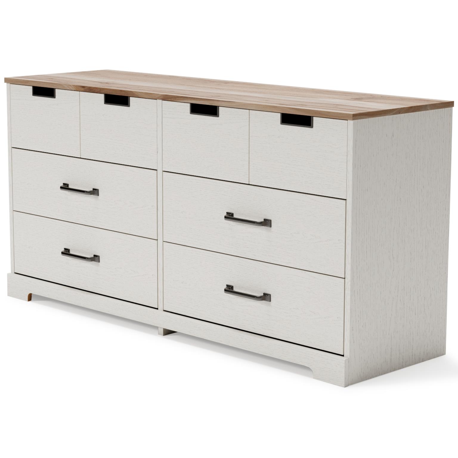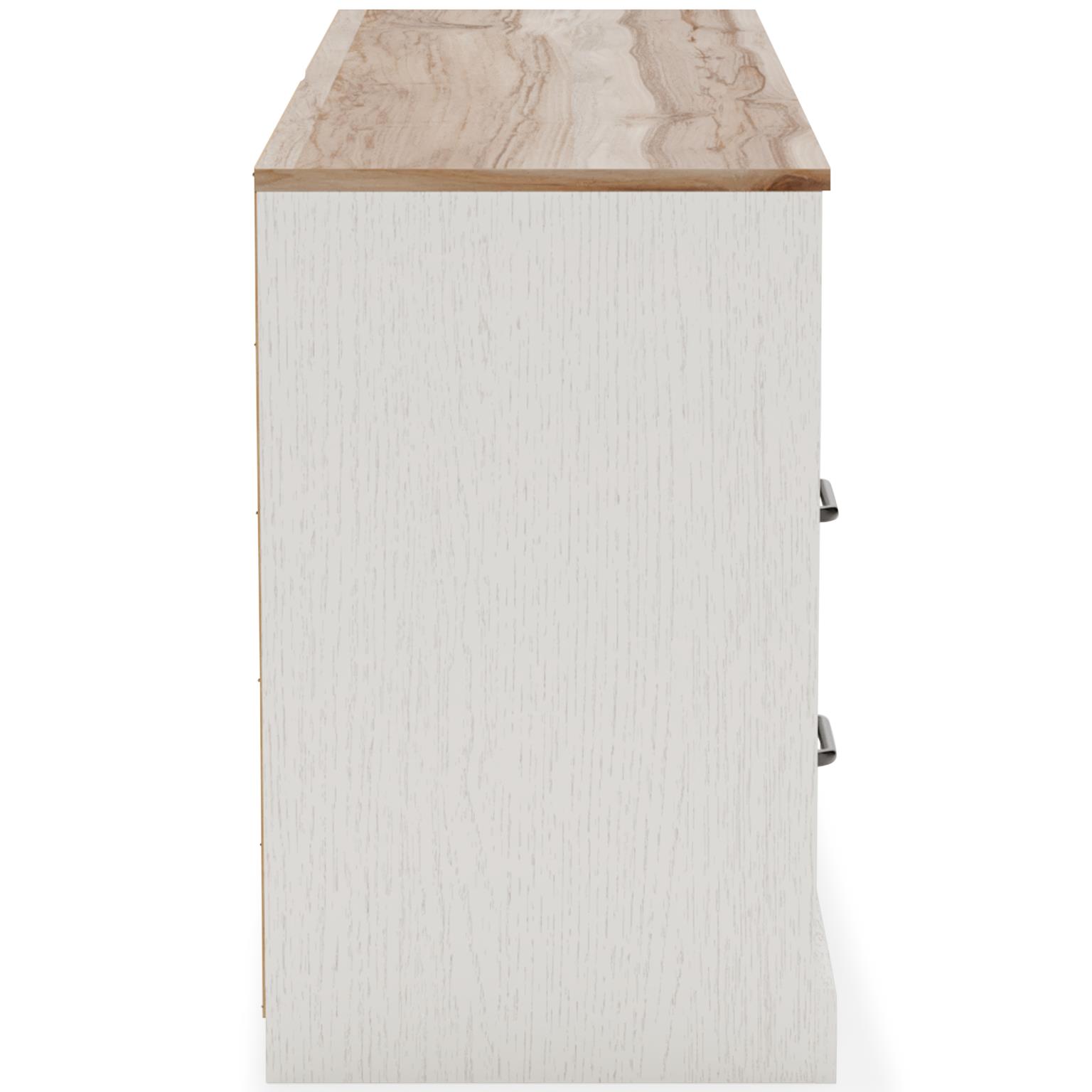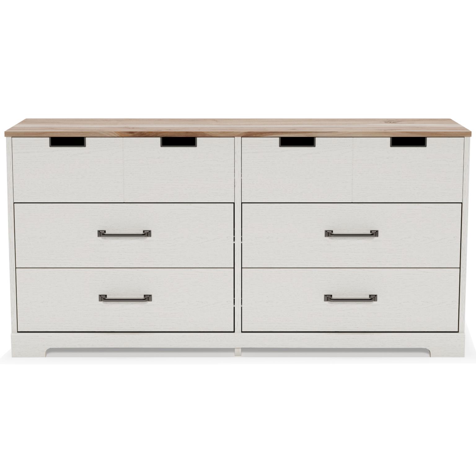 Fresh and inviting,,,, this dresser is truly versatile. A crisp white painted finish with a subtle replicated wood grain brings light to your room,,,, while a warm brown finish accents the top. Design details include metal cut-out openings along the upper drawers,,,, with the lower drawers paired with metal handles in an antiqued nickel-tone finish. Six smooth-gliding drawers provide plenty of storage,,,, so there’s no excuse for a messy room.