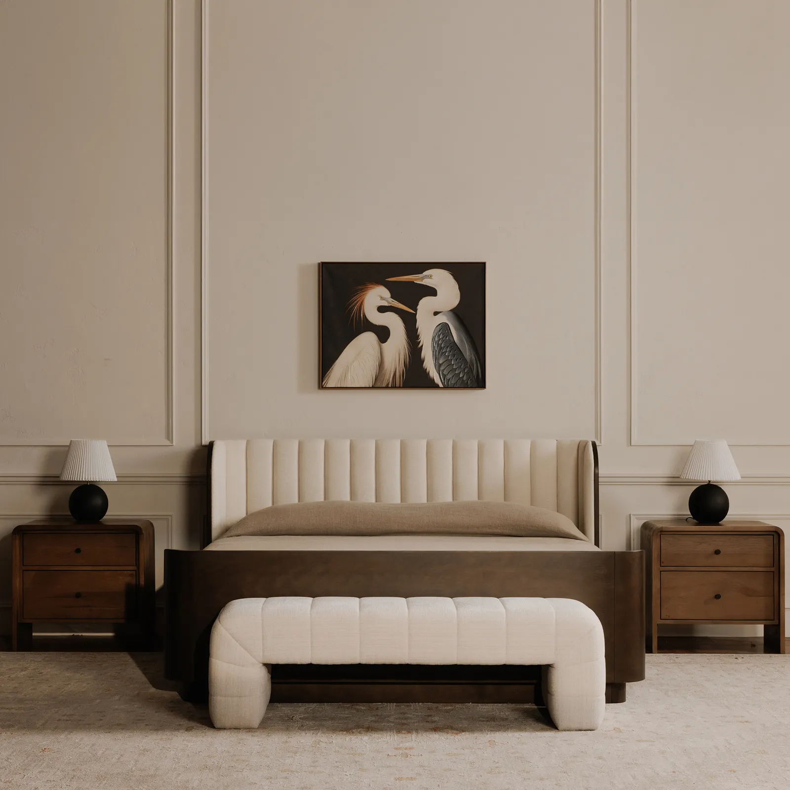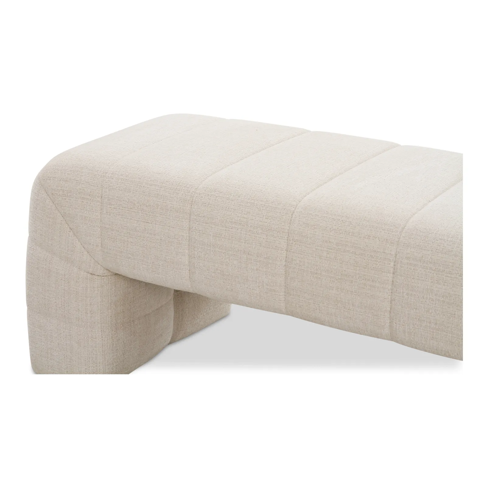 The Verity bench features a plump form enveloped in soft, flecked textured upholstery with warm tones for a touch of elegance. Wide channel detailing adds texture and visual interest, complemented by rich, warm tones that tell a story of comfort and coziness as the high-density foam seat provides a plush seating experience.