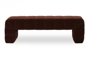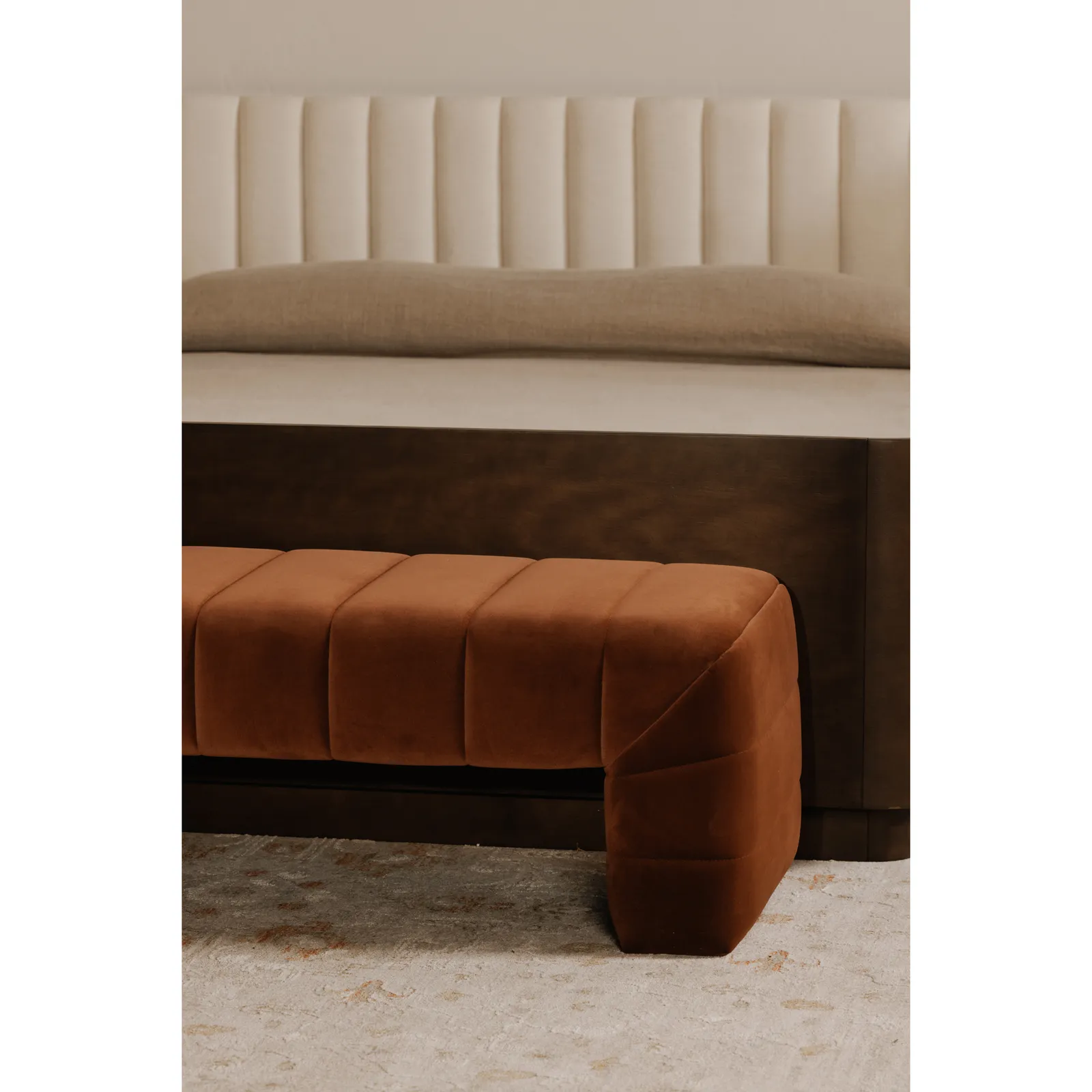 The Verity bench features a plump form enveloped in warm brown velvet upholstery for a touch of elegance. Wide channel detailing adds texture and visual interest, complemented by rich, warm tones that tell a story of comfort and coziness as the high-density foam seat provides a plush seating experience.