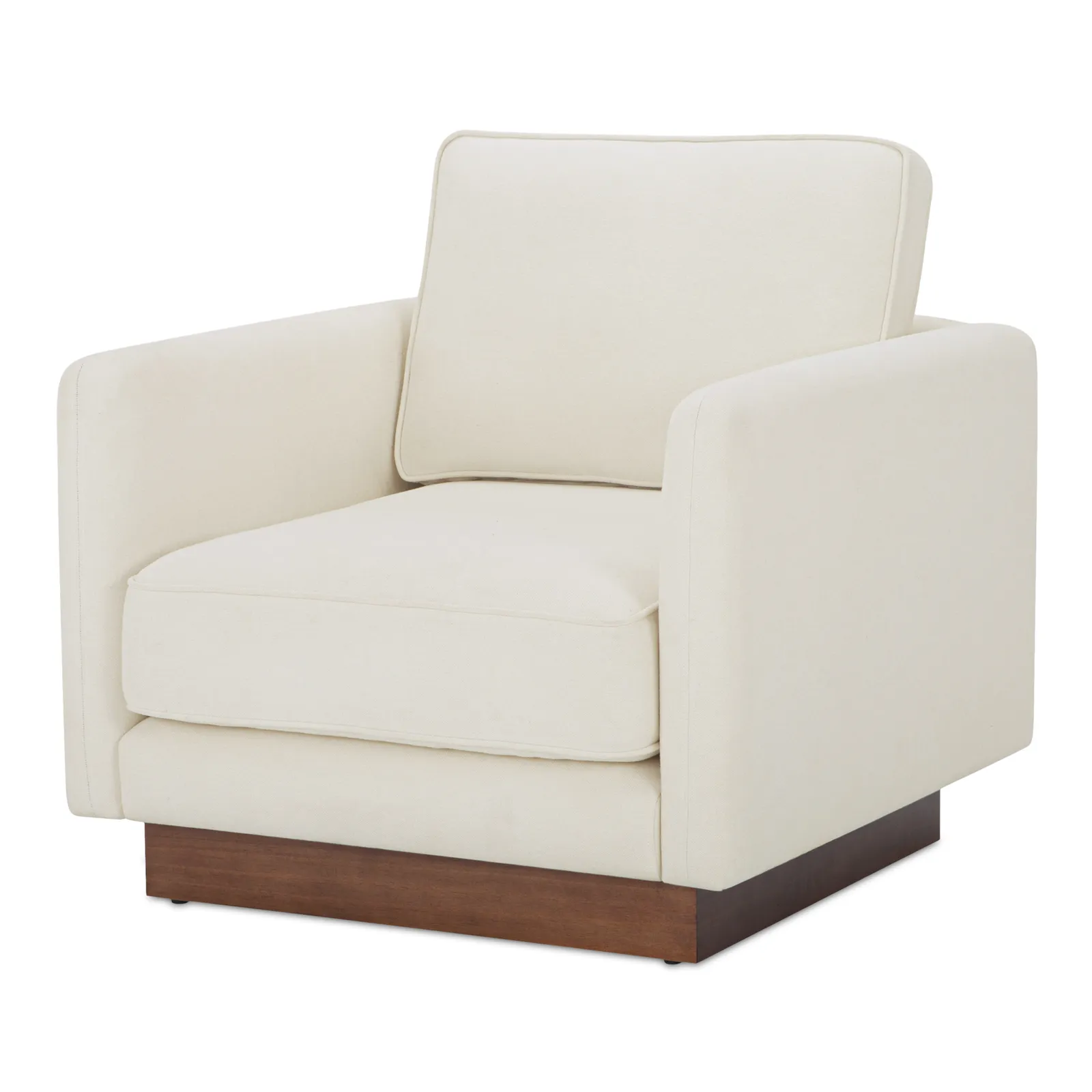 The Vernon accent chair blends mid-century design with modern functionality. It features a wooden plinth base for an elevated, lighter appearance. This chair offers unmatched comfort with removable cushions. Upholstered in durable, OEKO-TEX and Green Guard-certified fabric, it is ideal for family living, combining everyday practicality with durability.