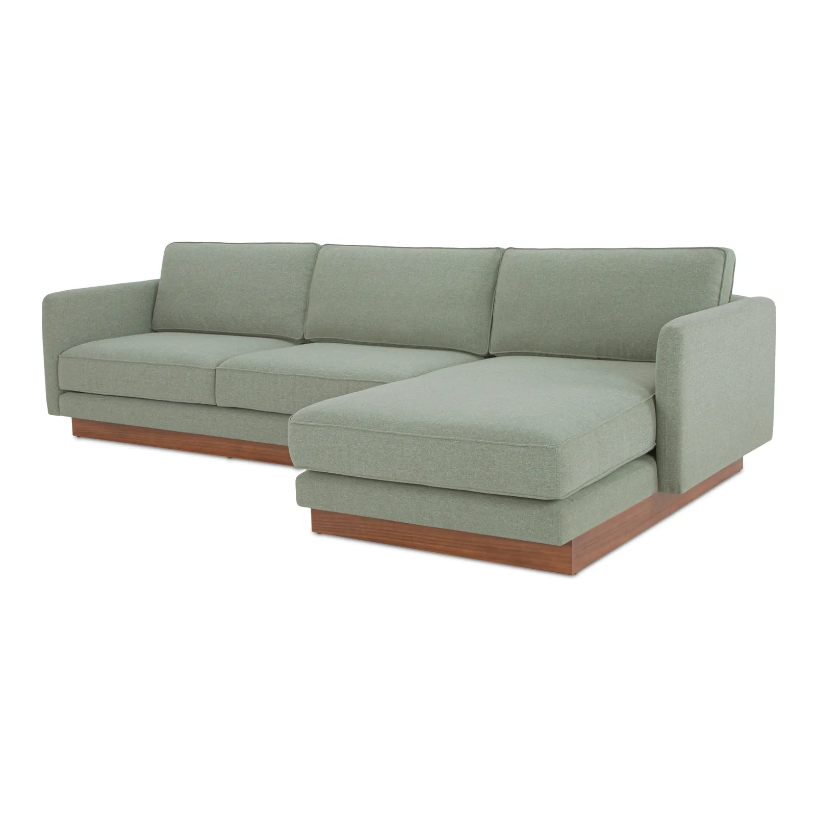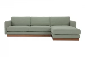 The Vernon sectional blends mid-century design with modern functionality. It features a wooden plinth base for an elevated, lighter appearance. This sectional offers unmatched comfort with removable cushions. Upholstered in durable, OEKO-TEX and Green Guard-certified fabric, it is ideal for family living, combining everyday practicality with durability.