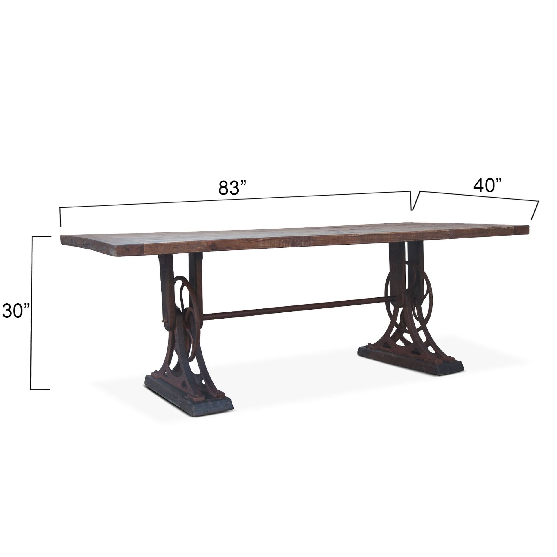 The Whitley collection combines vintage, rustic, and modern elements to create truly inspiring pieces crafted of reclaimed materials and metals in natural finishes. Each piece of furniture in this unique collection features fun, vintage details blended with functionality like adjustable cranks to fuse modern elements into the rustic styling. This unique dining table is ideal for creating an industrialized vintage look in your home. Made of solid reclaimed teak wood fashioned with a plank design across the body, the table top has a natural finish affording a nice view of the wood, while also offering durability for years to come. The cast iron trestle base has a natural patina finish with an industrial wheel accent near the bottom of each of the legs, and when paired with the wood table top, enhances the overall vintage feel of the piece. This dining table requires assembly and with materials of the finest quality, it will make the perfect addition to any casual dining room.