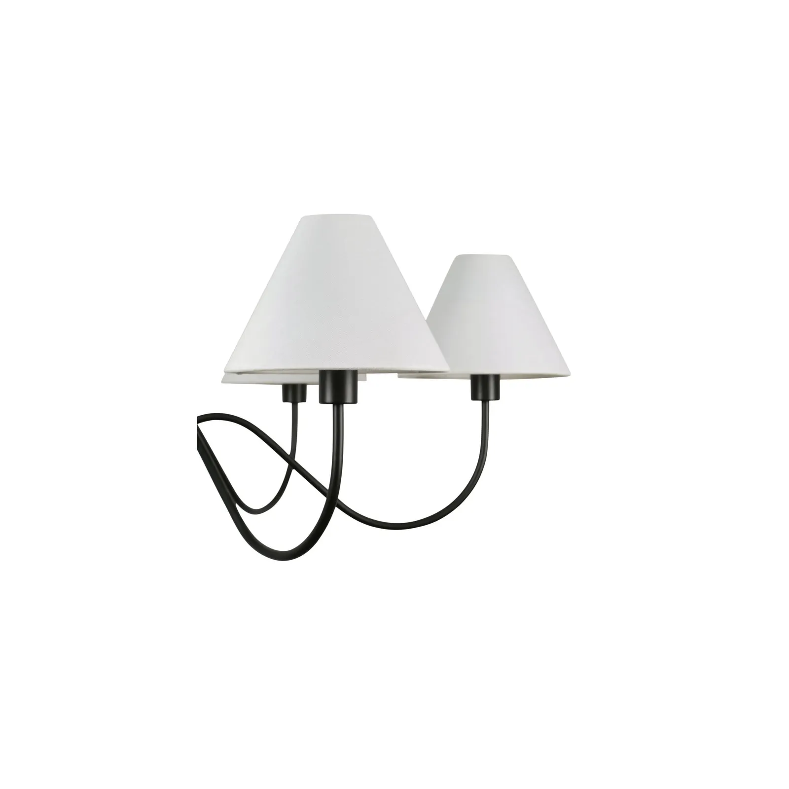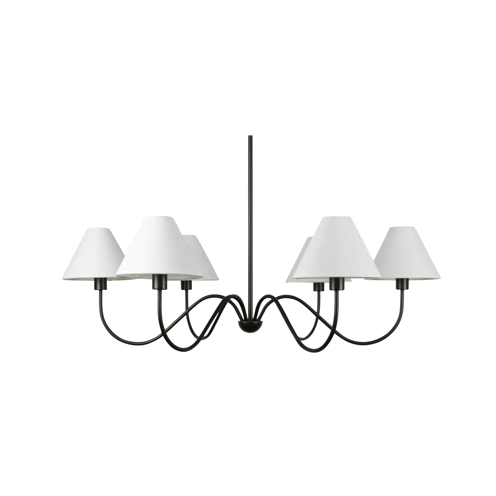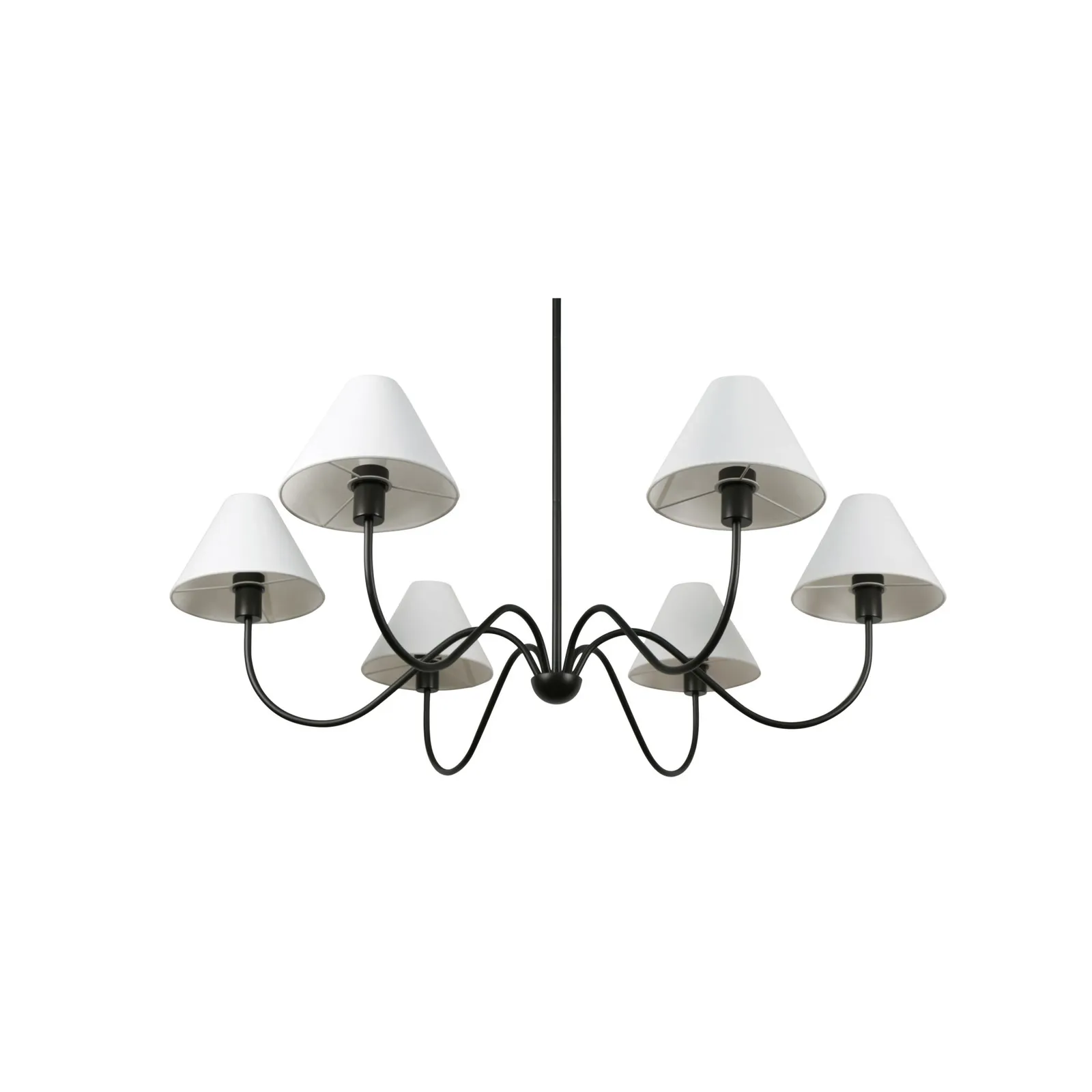 The Whitney chandelier’s gracefully curved arm in a blackened bronze finish creates a captivating silhouette, while a semi-circle finial serves as a refined focal point. Six lights, nestled in linen blend shades, cast a warm glow, balancing crisp white against dark metal.