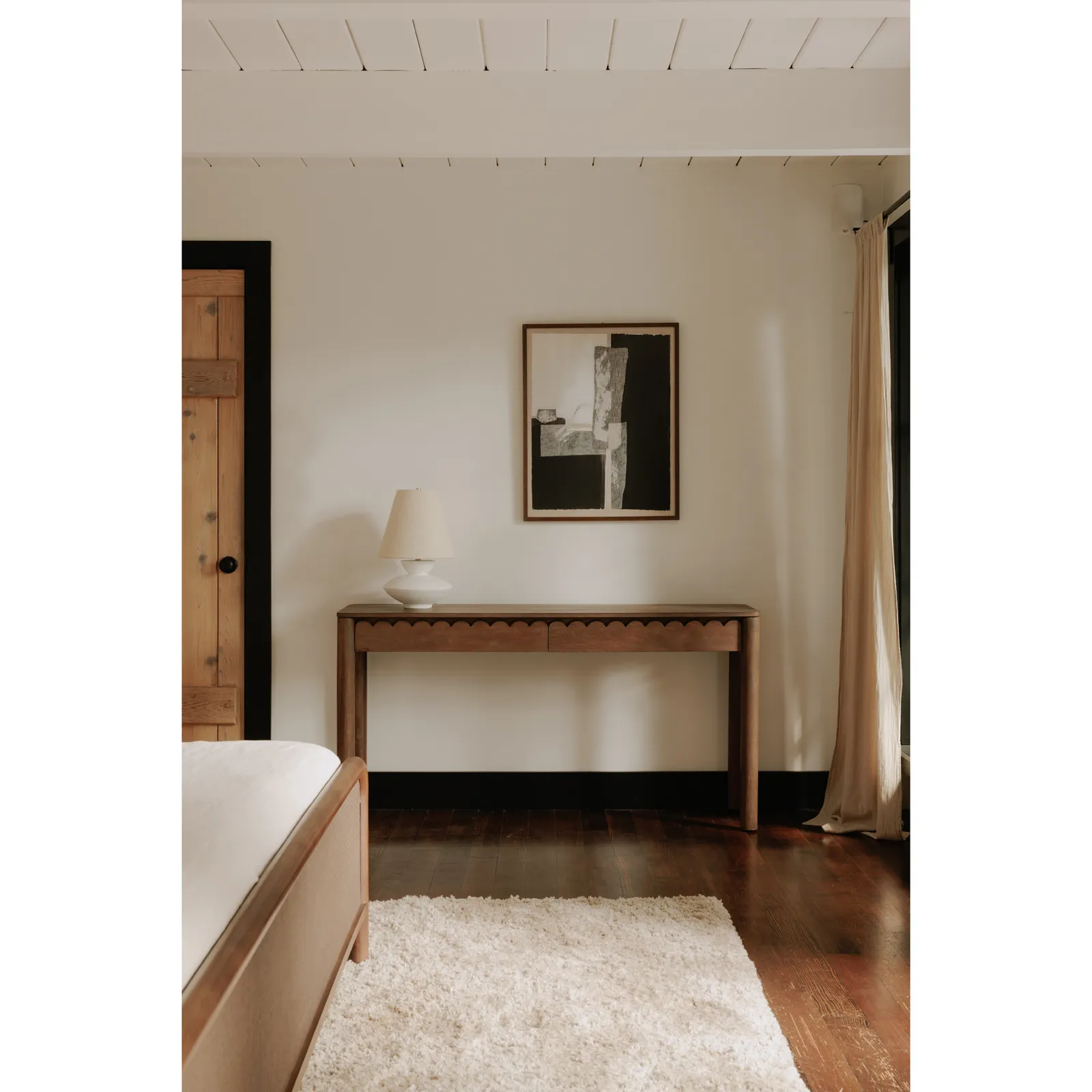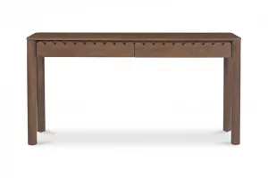Modern aesthetics effortlessly blend with the refined simplicity of traditional Shaker design in the Wiley console table. Meticulously crafted, its elegant form is defined by sleek, geometric curves that add a captivating touch of modernity. The post legs stand as pillars of strength, grounding the console table with their understated presence. A showcase of intricate scalloped edge details to the faces of the two drawers lends a timeless charm reminiscent of classical influences.