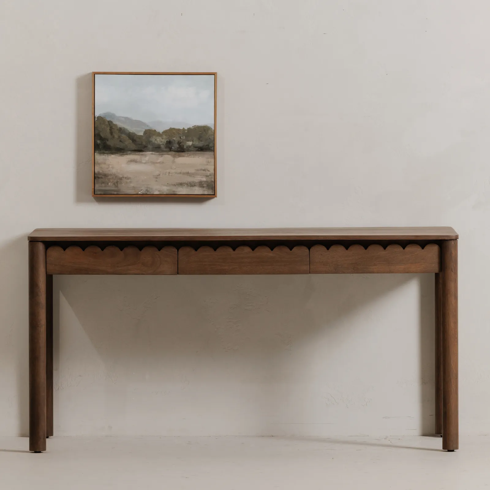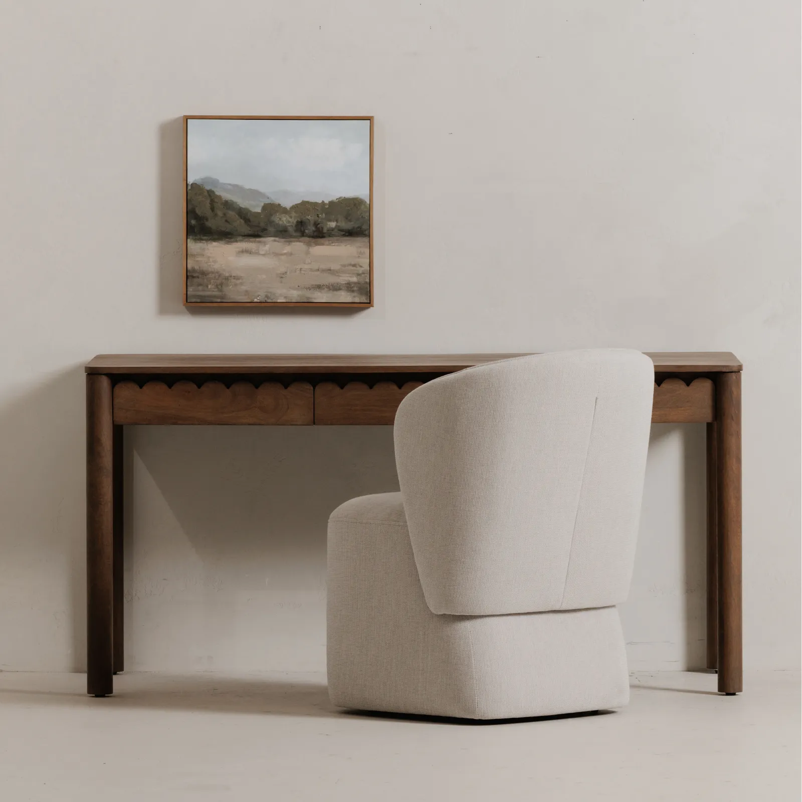 Modern aesthetics effortlessly blend with the refined simplicity of traditional Shaker design in the Wiley desk. Meticulously crafted, its elegant form is defined by sleek, geometric curves that add a captivating touch of modernity. The post legs stand as pillars of strength, grounding the desk with their understated presence. A showcase of intricate scalloped edge details to the faces of the three drawers lends a timeless charm reminiscent of classical influences.