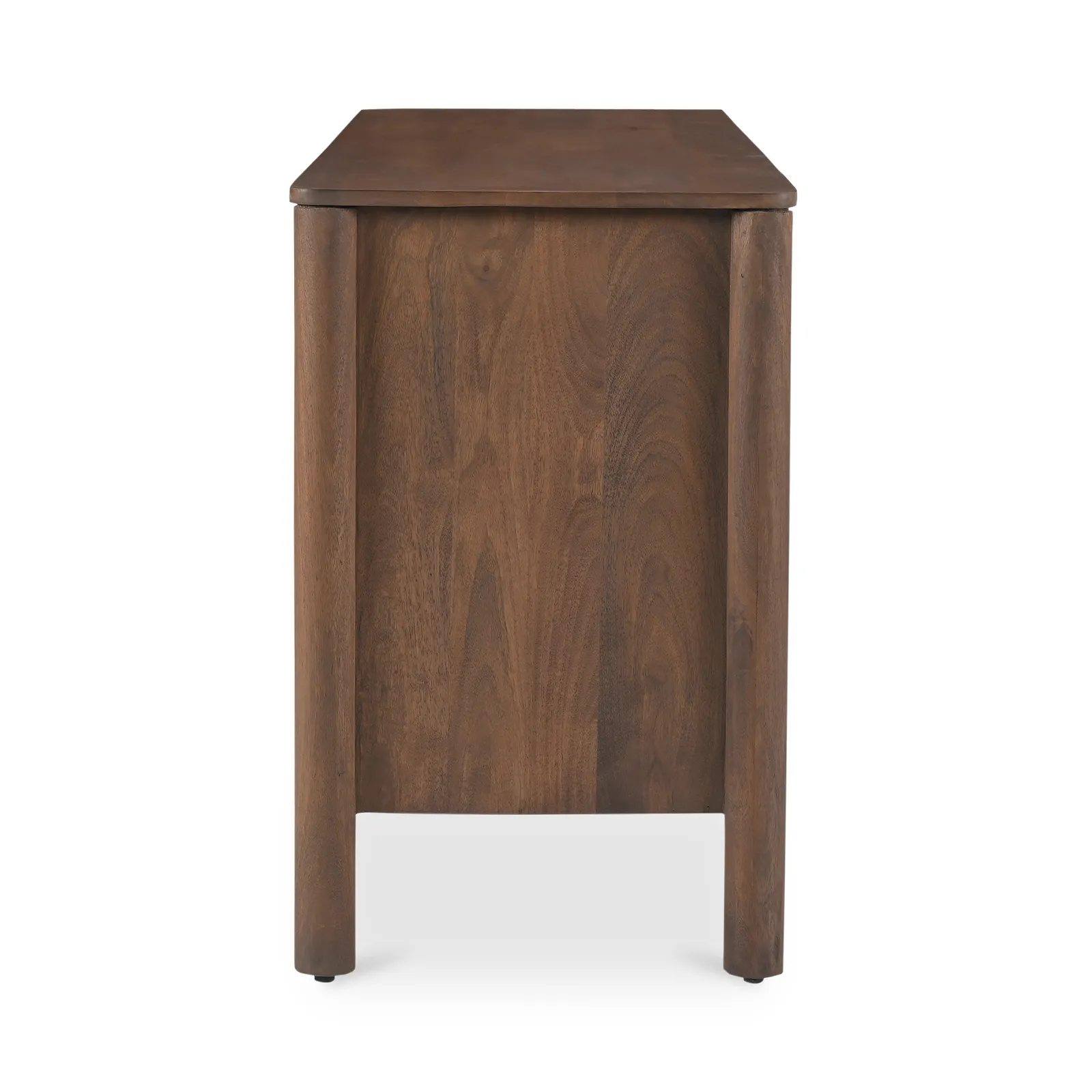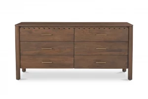 Modern aesthetics effortlessly blend with the refined simplicity of traditional Shaker design in the Wiley dresser. Meticulously crafted, its elegant form is defined by sleek, geometric curves that add a captivating touch of modernity. The post legs stand as pillars of strength, grounding the desk with their understated presence. A showcase of intricate scalloped edge details to the faces of the drawers lends a timeless charm reminiscent of classical influences.