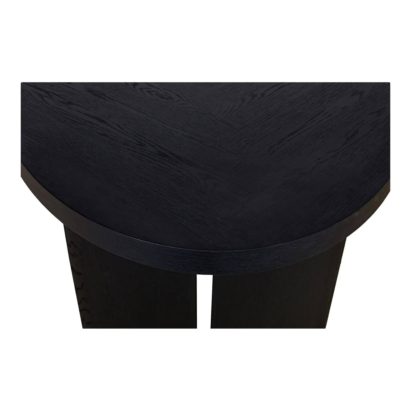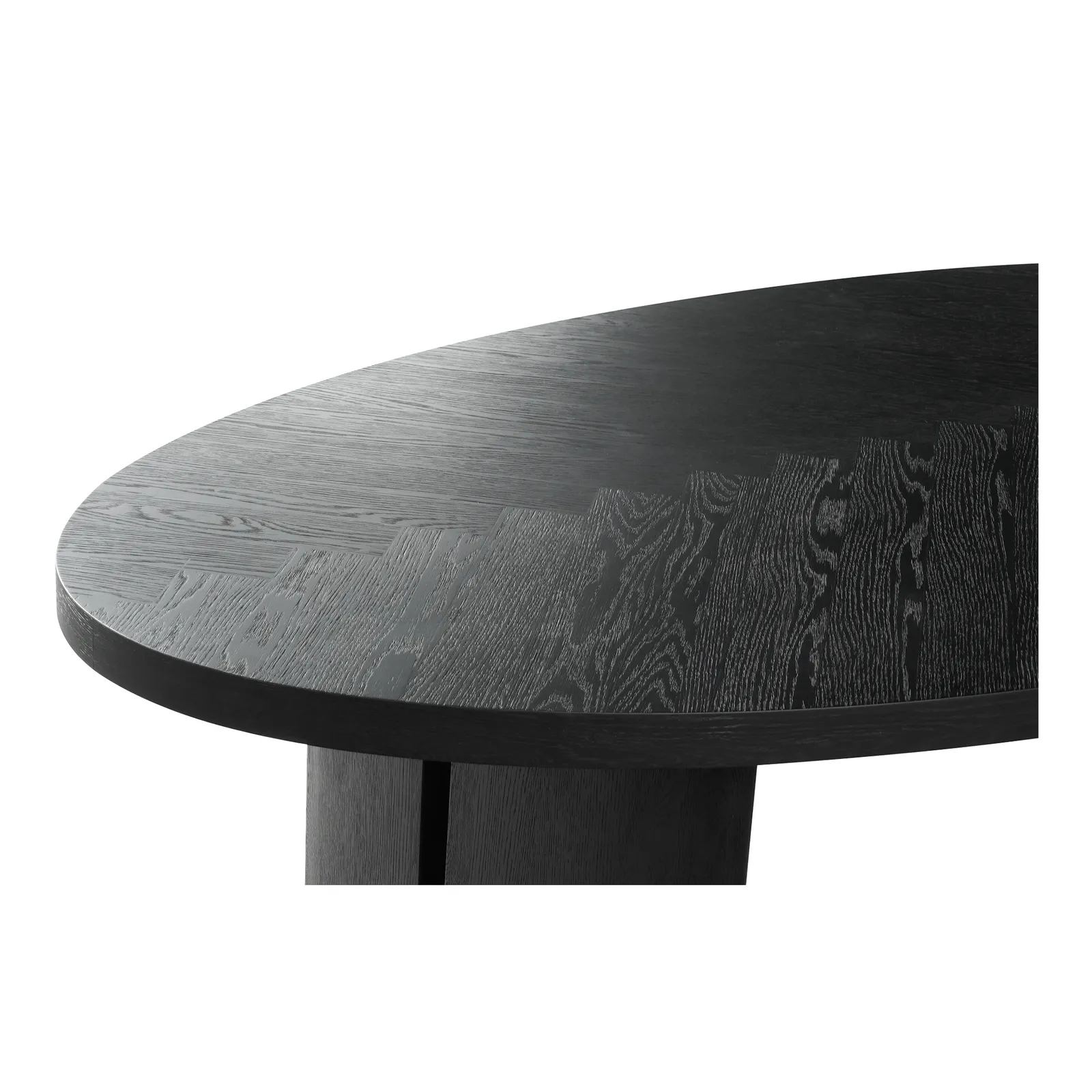 The William dining table showcases a contemporary silhouette with a rounded edge base and beautifully detailed herringbone pattern tabletop. The black stain finish adds a sense of maturity, complementing the captivating parquetry pattern on the exterior surfaces. A thick tabletop enhances the overall aesthetic appeal, underscoring the rustic pattern.