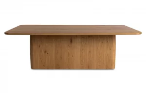 The Winston coffee table’s commanding plinth base features softly rounded edges at all four corners, offering a hefty, substantial design poised to be the centerpiece of any space. Finished in a rustic oak veneer with expressive knots highlighting the wood’s natural charm, it crafts a striking contrast between old and new.