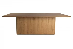 The Winston dining table’s commanding plinth base features softly rounded edges at all four corners, offering a hefty, substantial design poised to be the centerpiece of any dining room. Finished in a rustic oak veneer with expressive knots highlighting the wood’s natural charm, it crafts a striking contrast between old and new.
