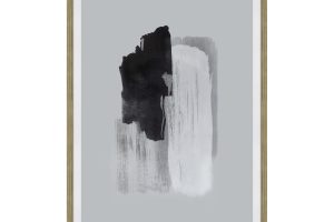 Monotone simplicity from the Wisdom 1 wall painting is paired with unique layering and unknown intention. An evocative abstract piece, this ink print features twin textured smears of black and white, blending to grey in the background. A polystyrene frame with oak finish adds an organic, polished quality to this print.