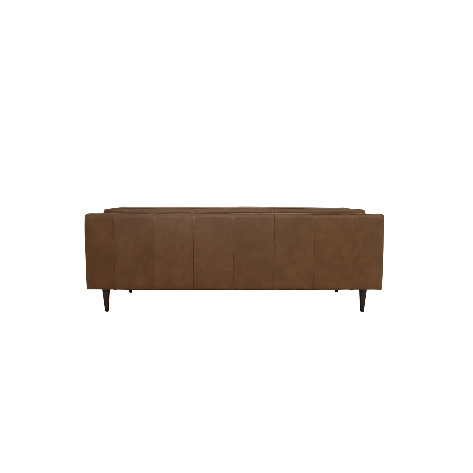 Wrapped in rich top-grain leather, the Woods sofa’s mid-century-inspired silhouette features enveloping cushioned arms and tapered wooden legs. Patinaed hues exude warmth, while subtle stitching adds refinement to the sink-into comfort of fiber-topped cushions.
