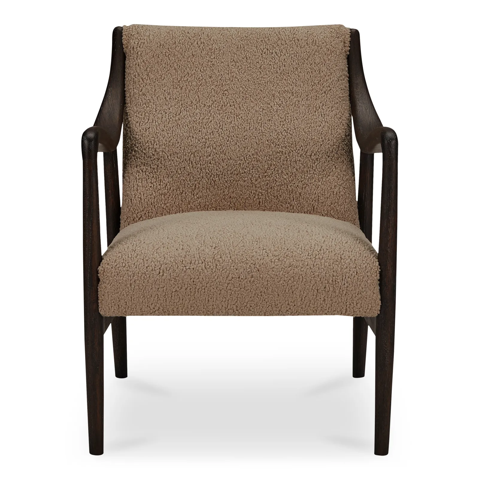 The Yates accent chair’s solid oak frame and sumptuous faux shearling merge the coziness of plush upholstery with the timeless beauty of classic craftsmanship. Its deep brown finish enhances the wood’s natural grain, offering traditional charm to its slim, mid-century design. The curved, slender arms broaden for restful support, balancing the chair’s sleek profile with practicality.
